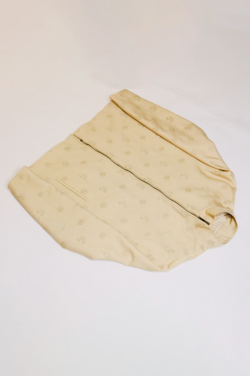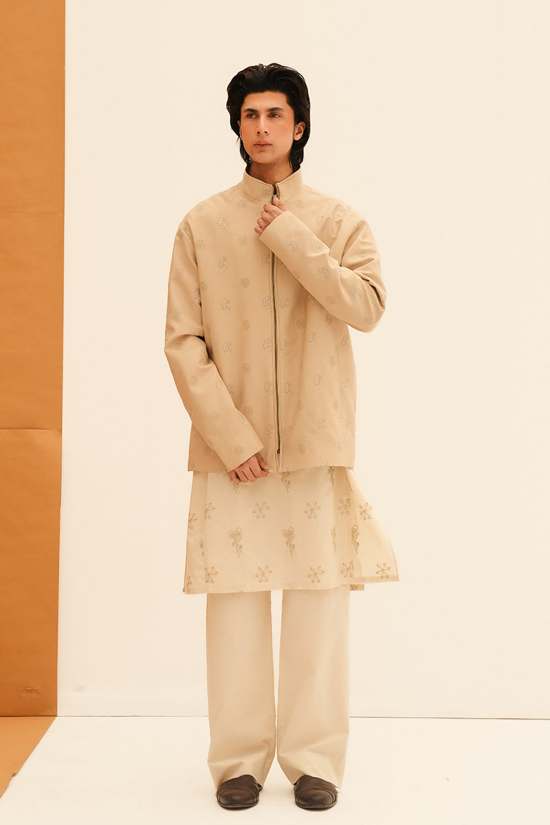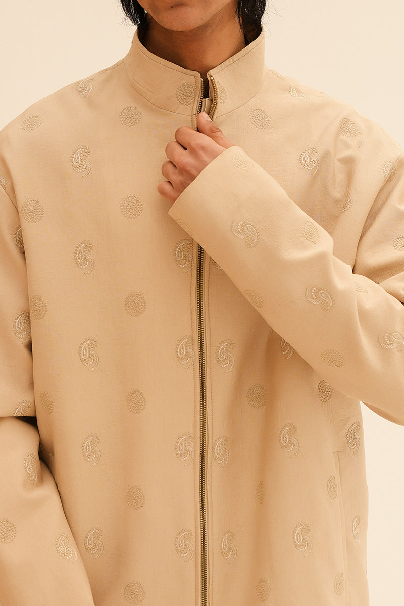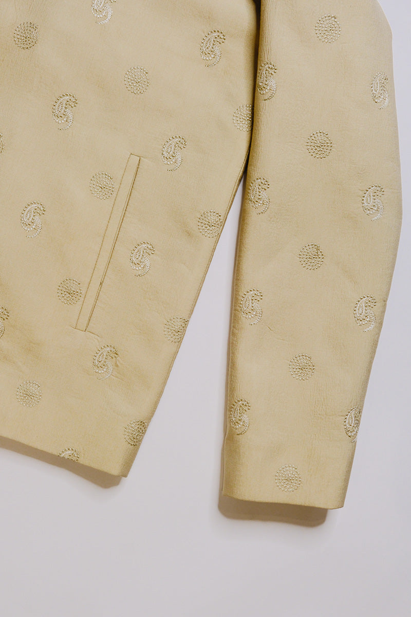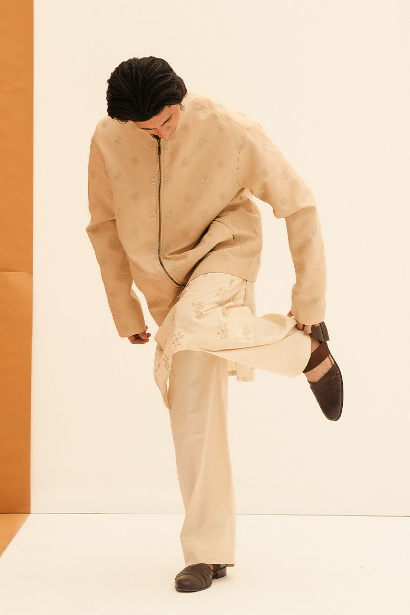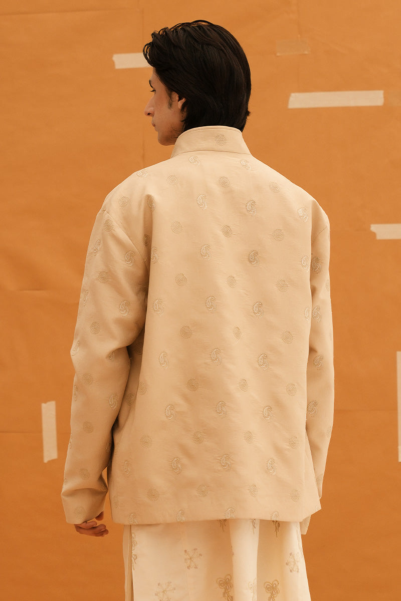 The effortless and timeless Ardh jacket, intricately embroidered with paisley and spiral motifs cut for a relaxed yet tailored feel.