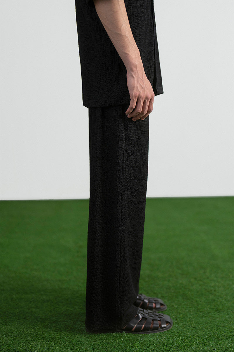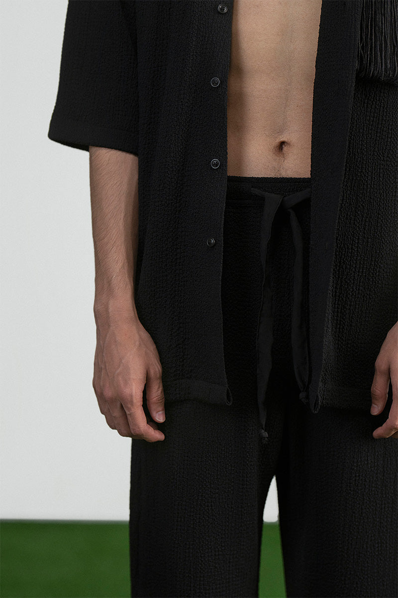 Relaxed fit, tailored pyjama style trousers with a drawstring waistband. Crafted in an effortless crinkled knit cotton fabric. Wear it with the Cairo Fringe Resort Shirt to complete the look.