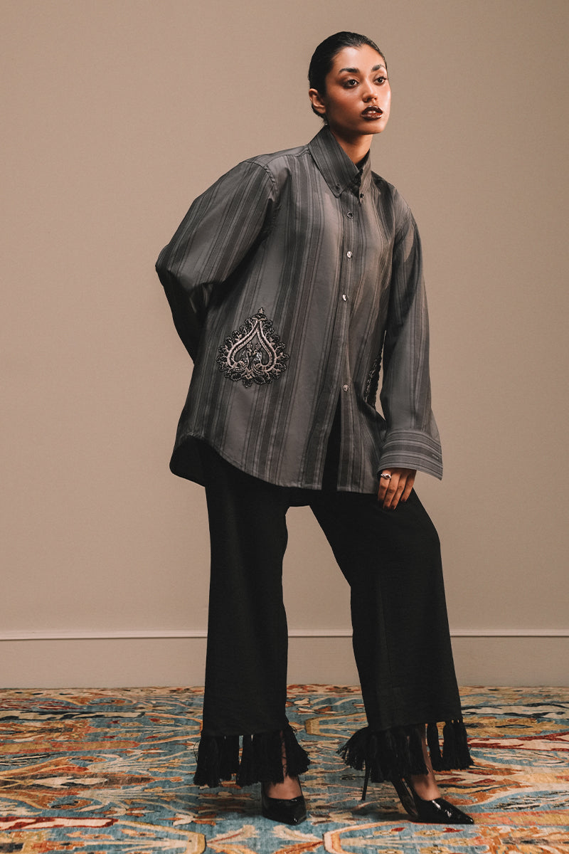 A refined essential elevated with hand embroidered detailing. An effortless buttoned shirt with Aomi’s signature “Peacock in Love” motifs richly embroidered and hand-embellished with beads, sequins, cutdana, and kora. To be worn both as a staple and a standout.