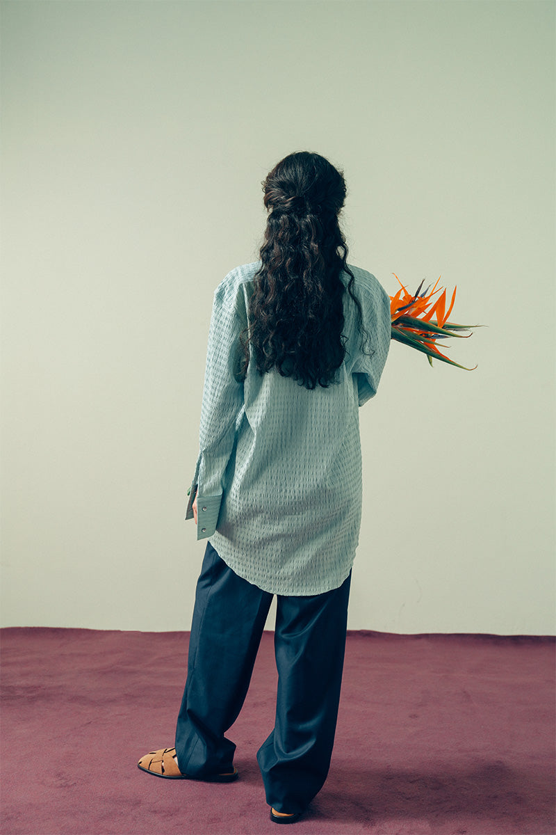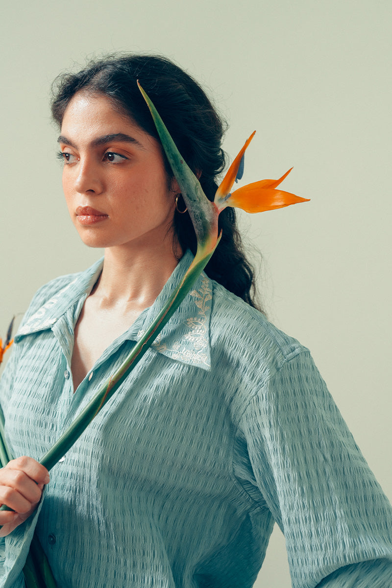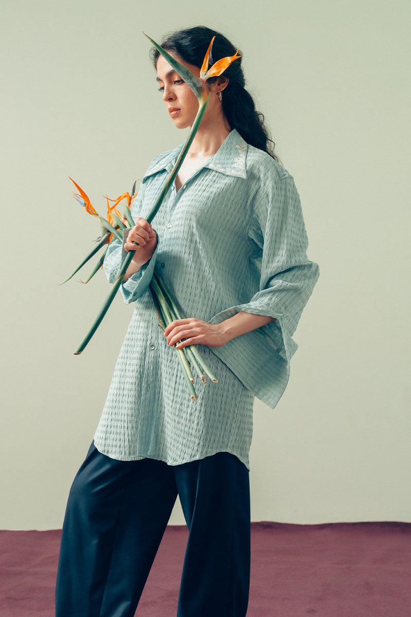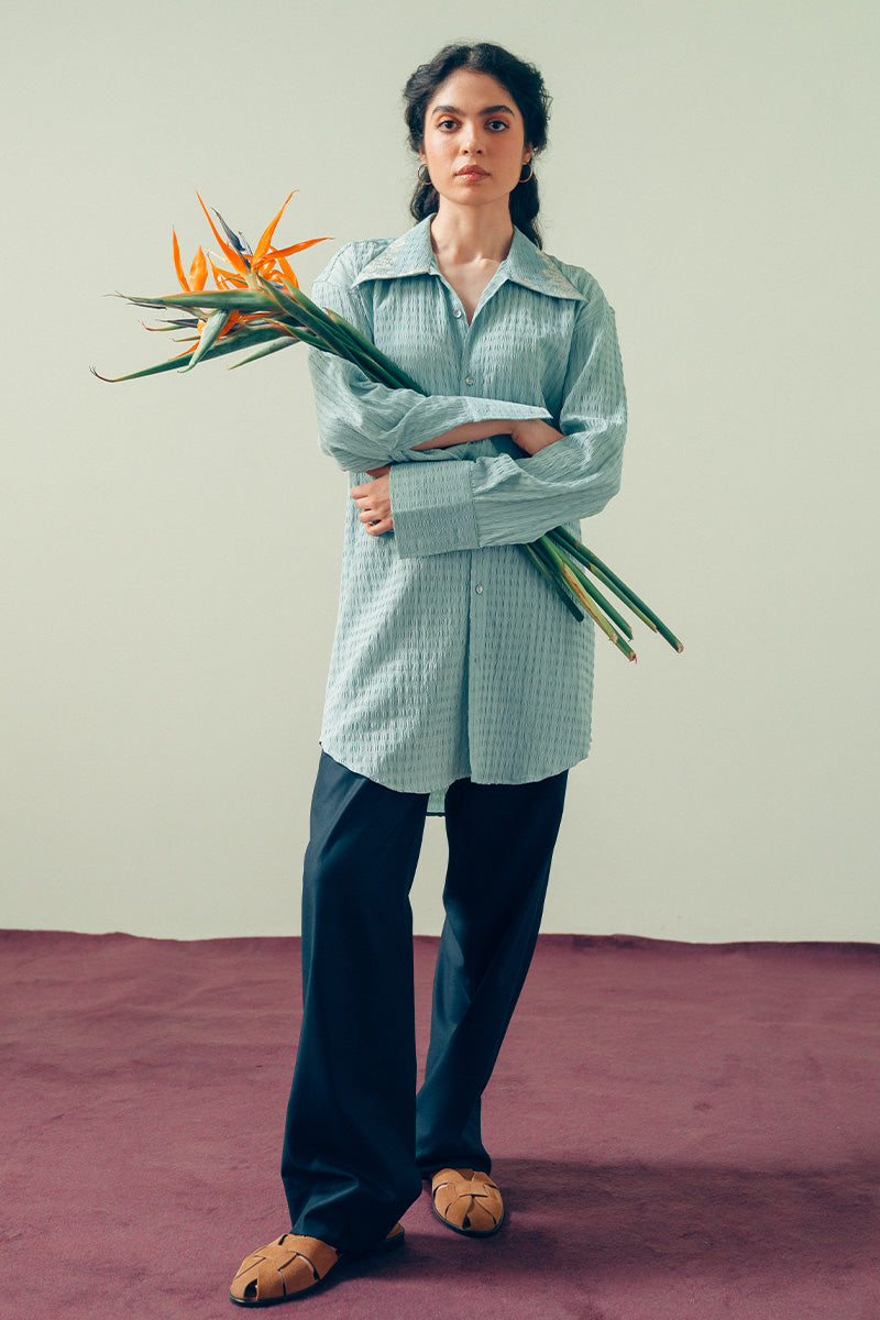 A relaxed cut shirt with an oversized collar detailed with intricate embroidery.