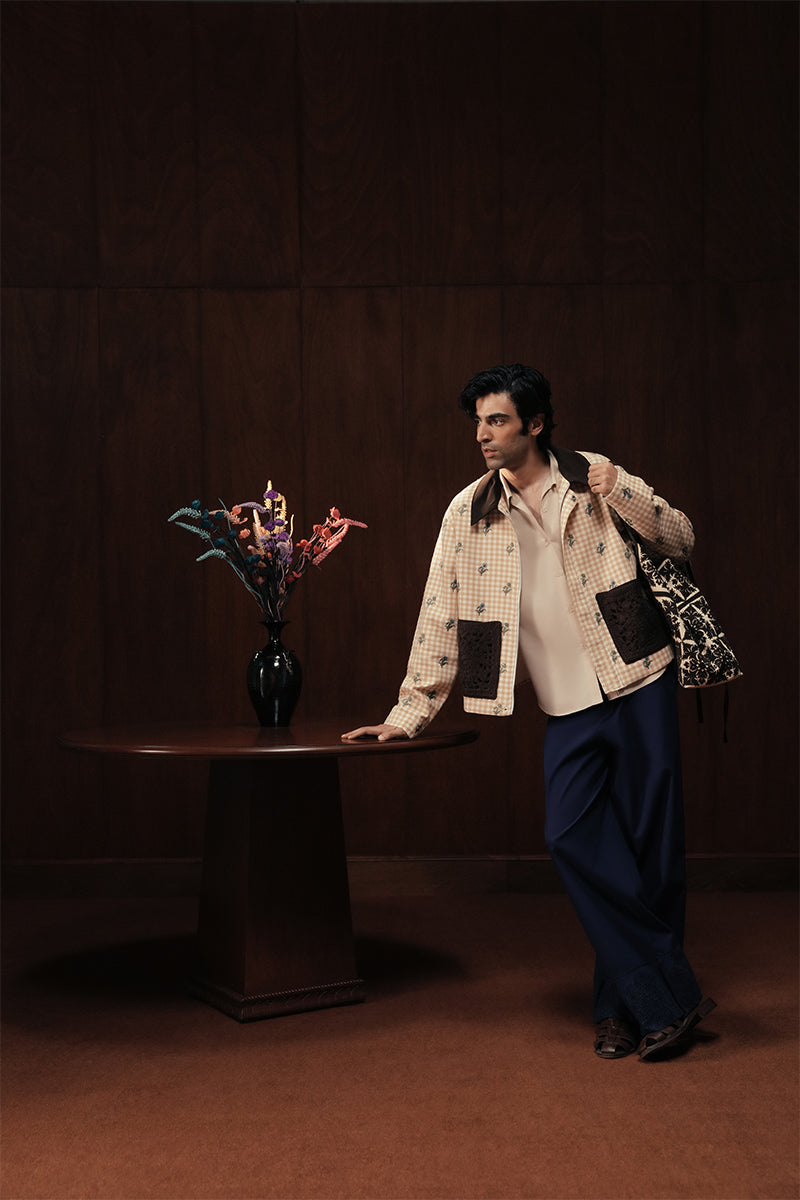 This checkered jacket, rendered in soft beige and white hues, is elevated by a dark chocolate collar that anchors the silhouette in bold contrast. All-over floral embroidery in earthy greens and blues lends depth, subtly illuminated with hand embroidered beadwork for a refined shimmer. The jacket is detailed with hand-made crochet-trimmed pockets. A considered balance of classic pattern and intricate handwork, the jacket embodies craft as a quiet statement.
