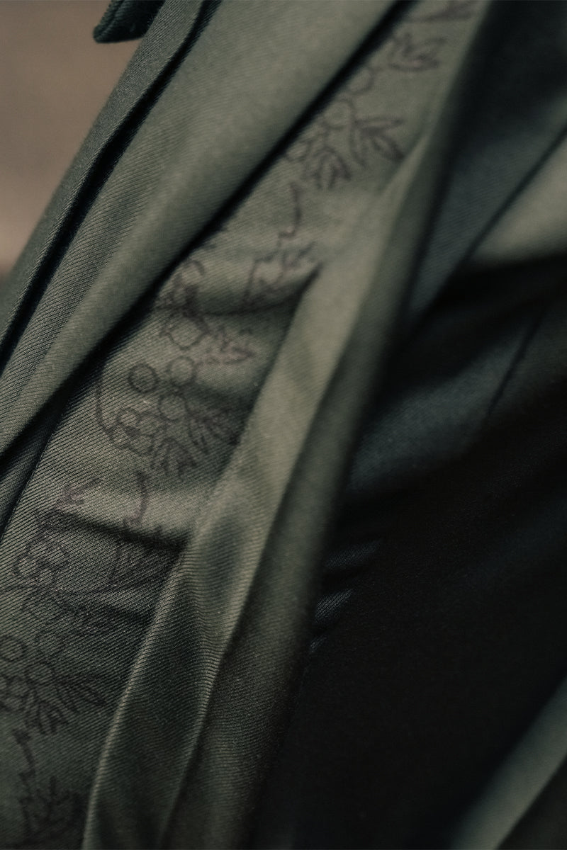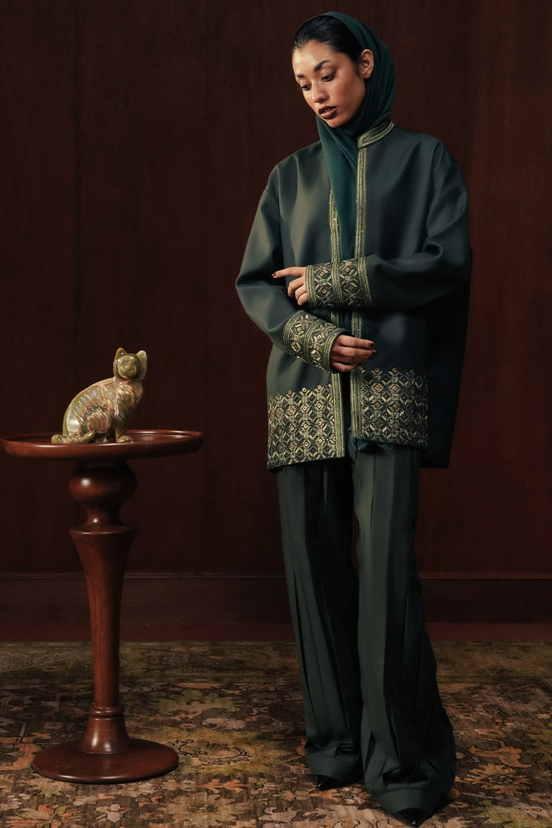 A study in craft and tailoring, these trousers feature hand-formed vertical pleats, each concealing subtle vintage block-printed motifs sourced from Skardu,Pakistan. Precision and heritage intertwined in a modern silhouette.