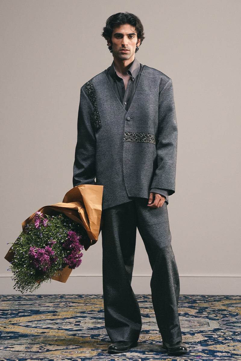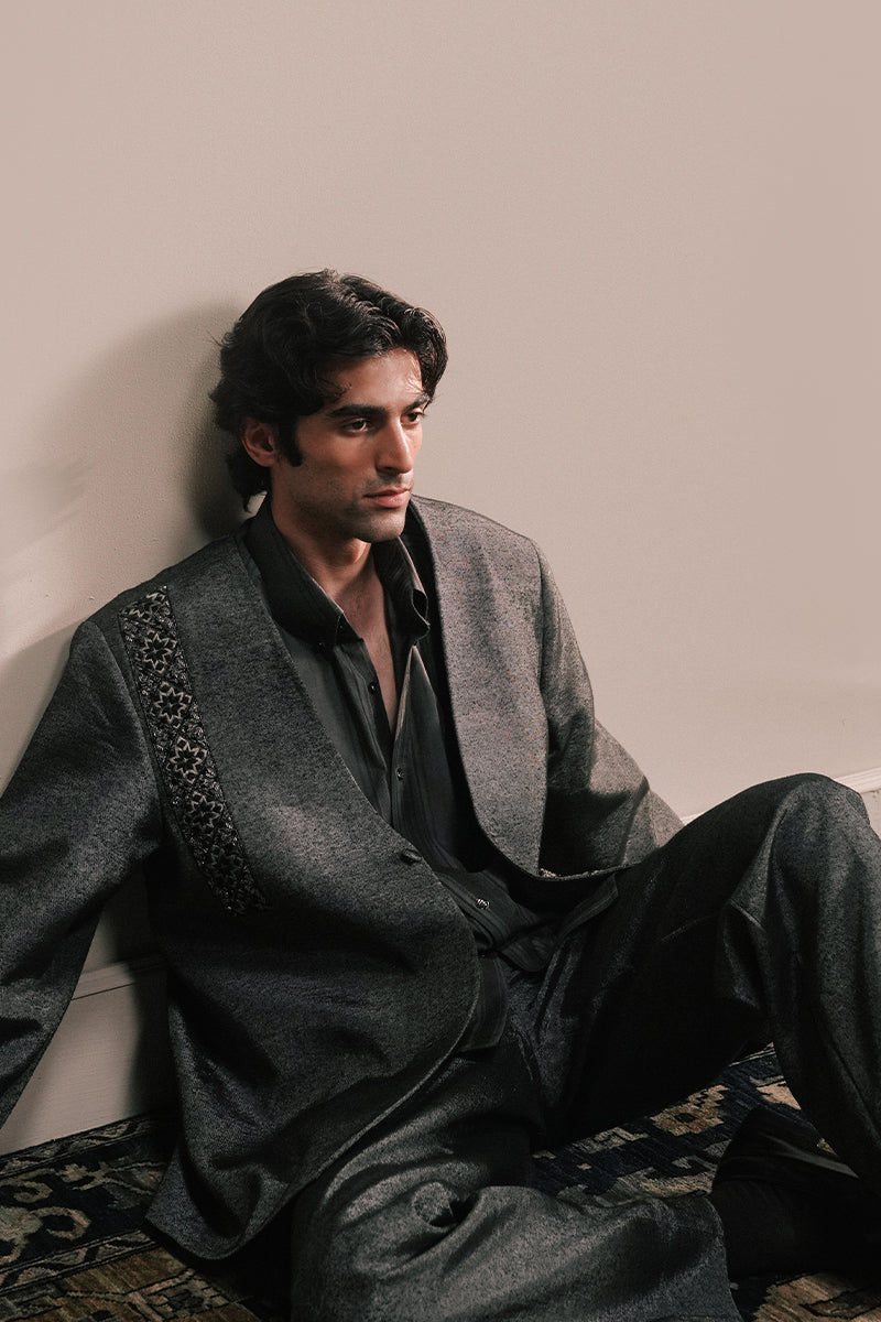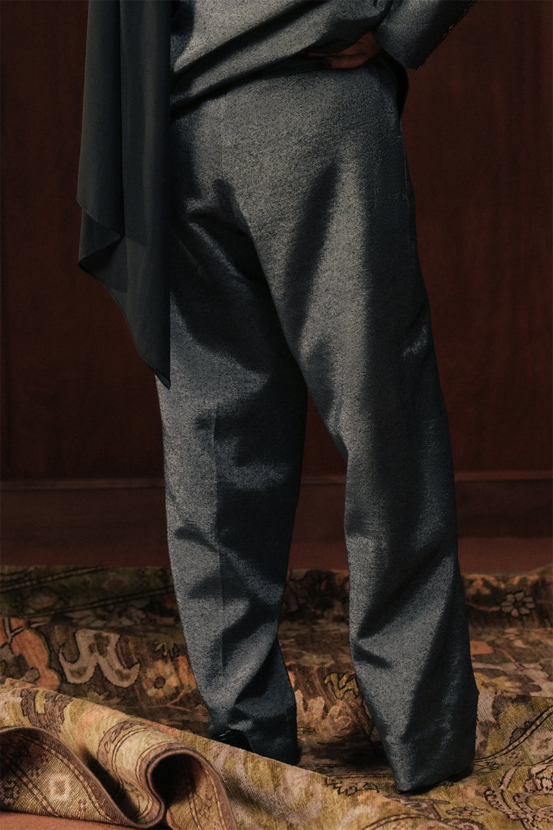 Tailored trousers in luxurious Silk Karandi in slate black with a slight shimmer. Pair it with the Zavia Hand Embroidered Blazer