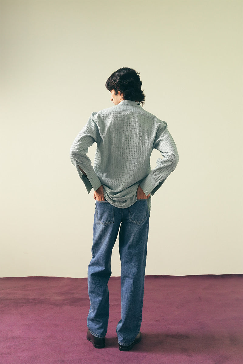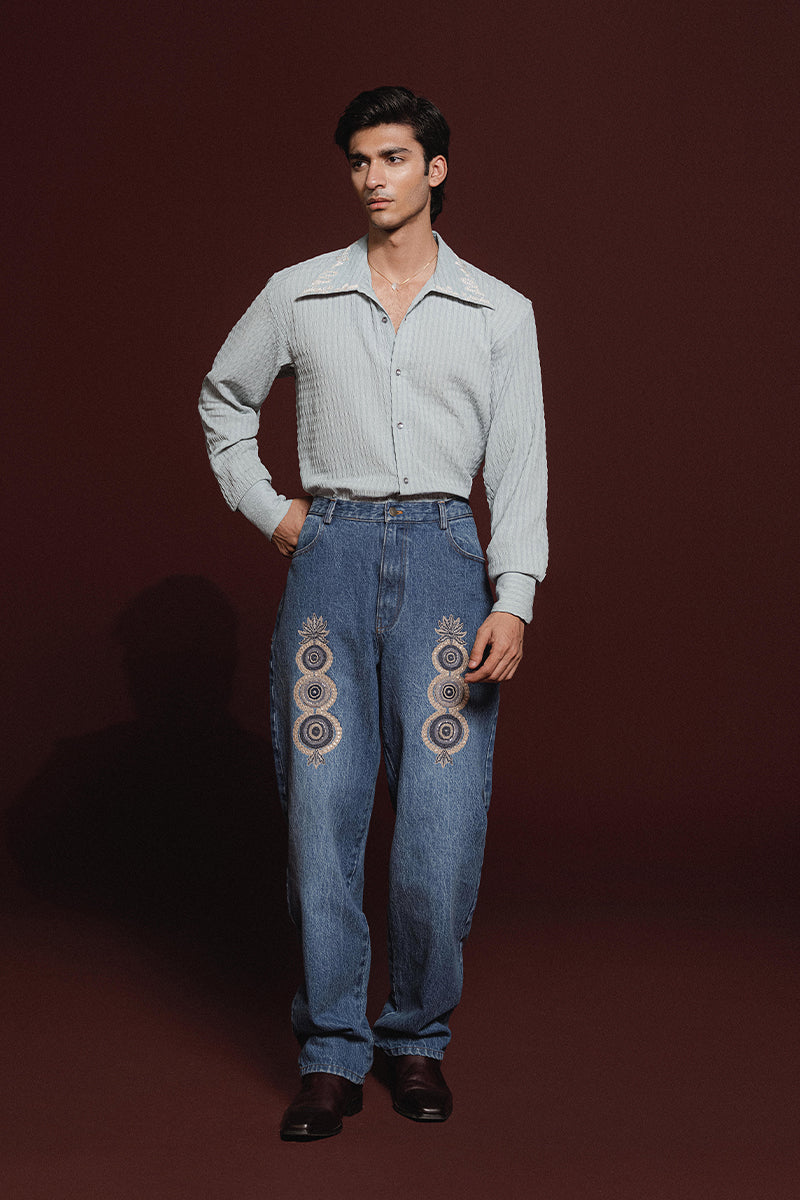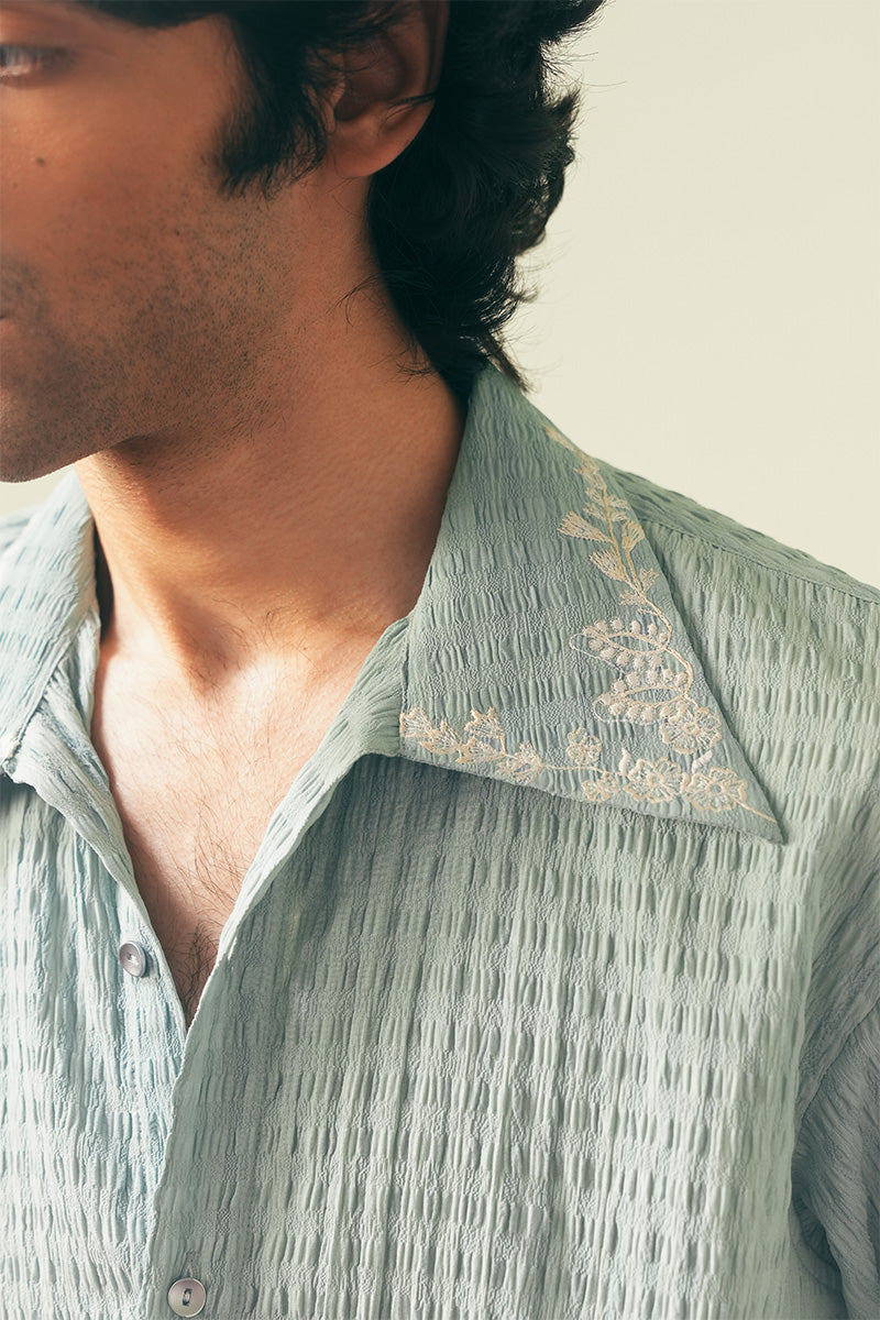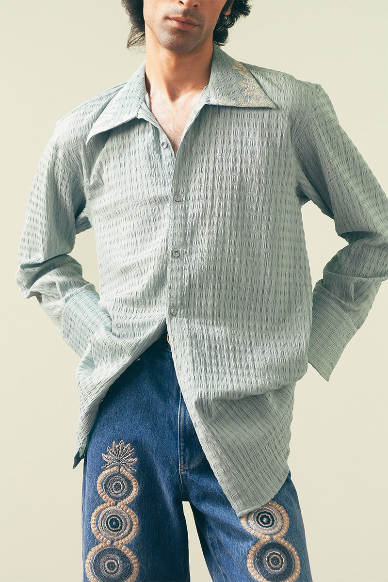 A relaxed cut shirt with an oversized collar detailed with intricate embroidery.