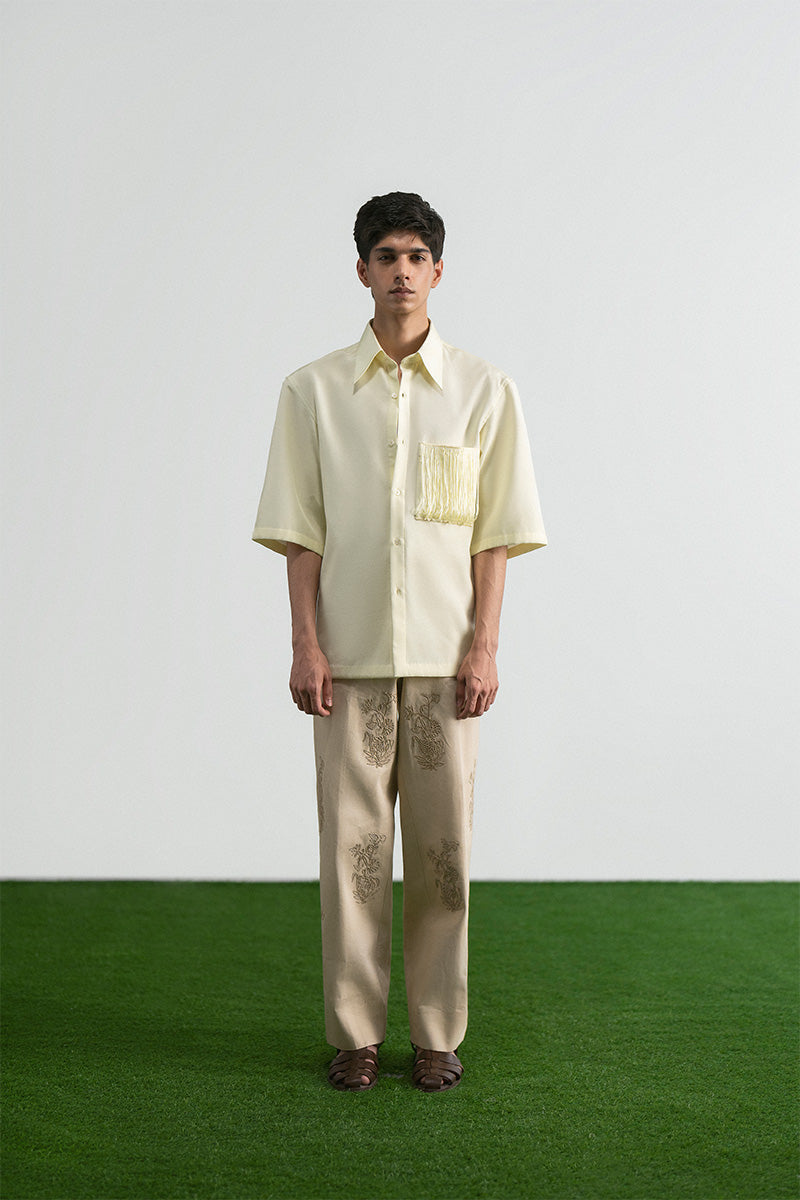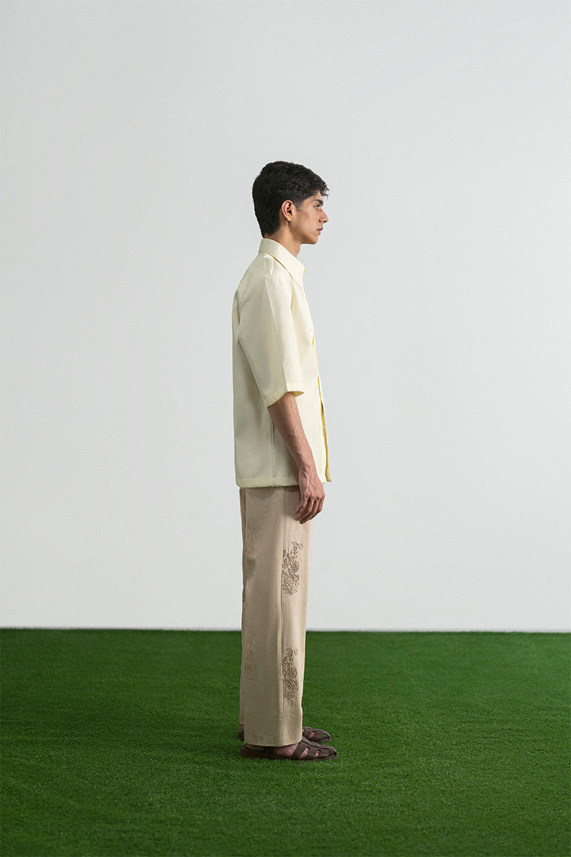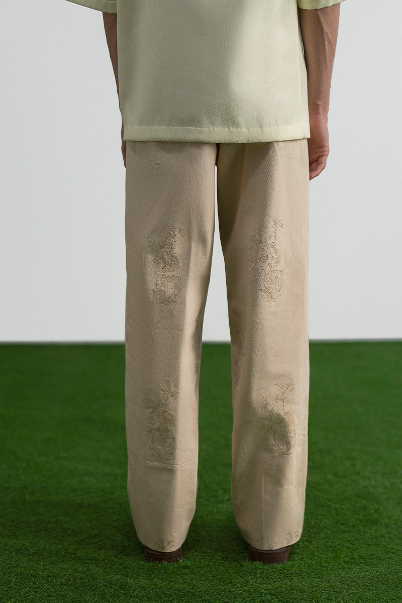 Cream toned, relaxed fit, denim trousers featuring monotone embroidery beautifully enhanced with hand crafted cord detailing.