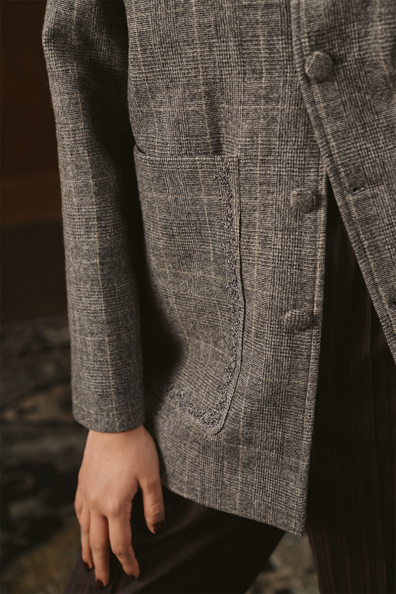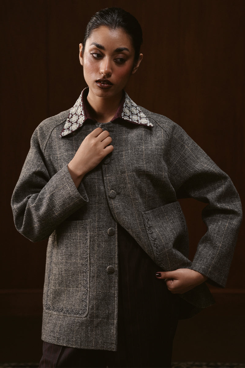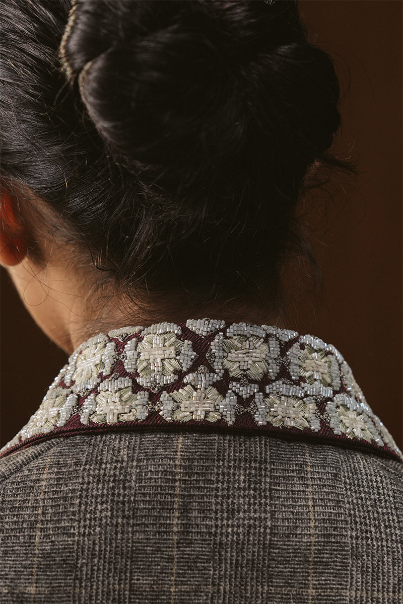A play on colour, patternwork and texture, the classic, structured woolen check jacket features subtly embroidered front pockets, offset by a contrasting burgundy collar with extensive hand embroidered patternwork.