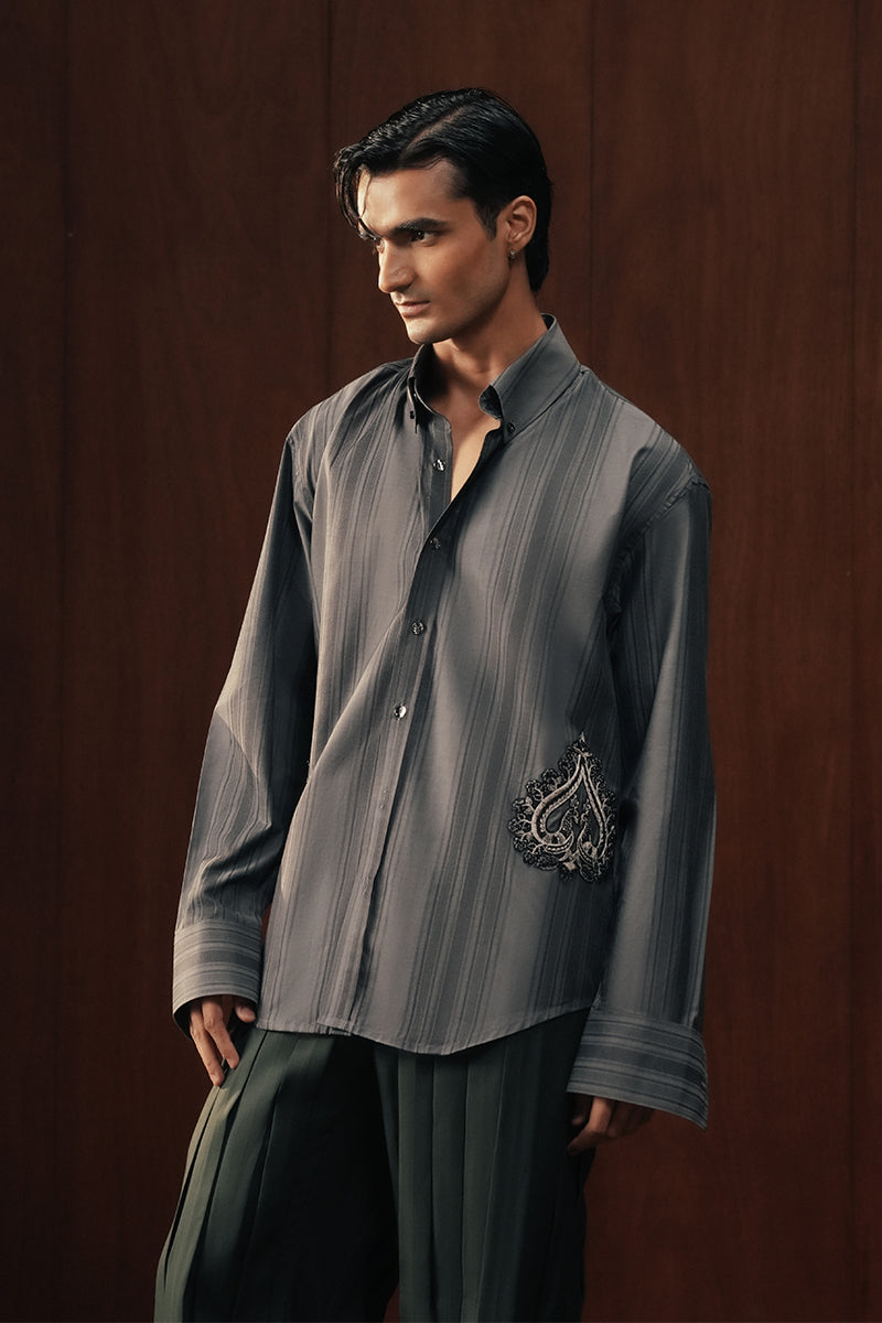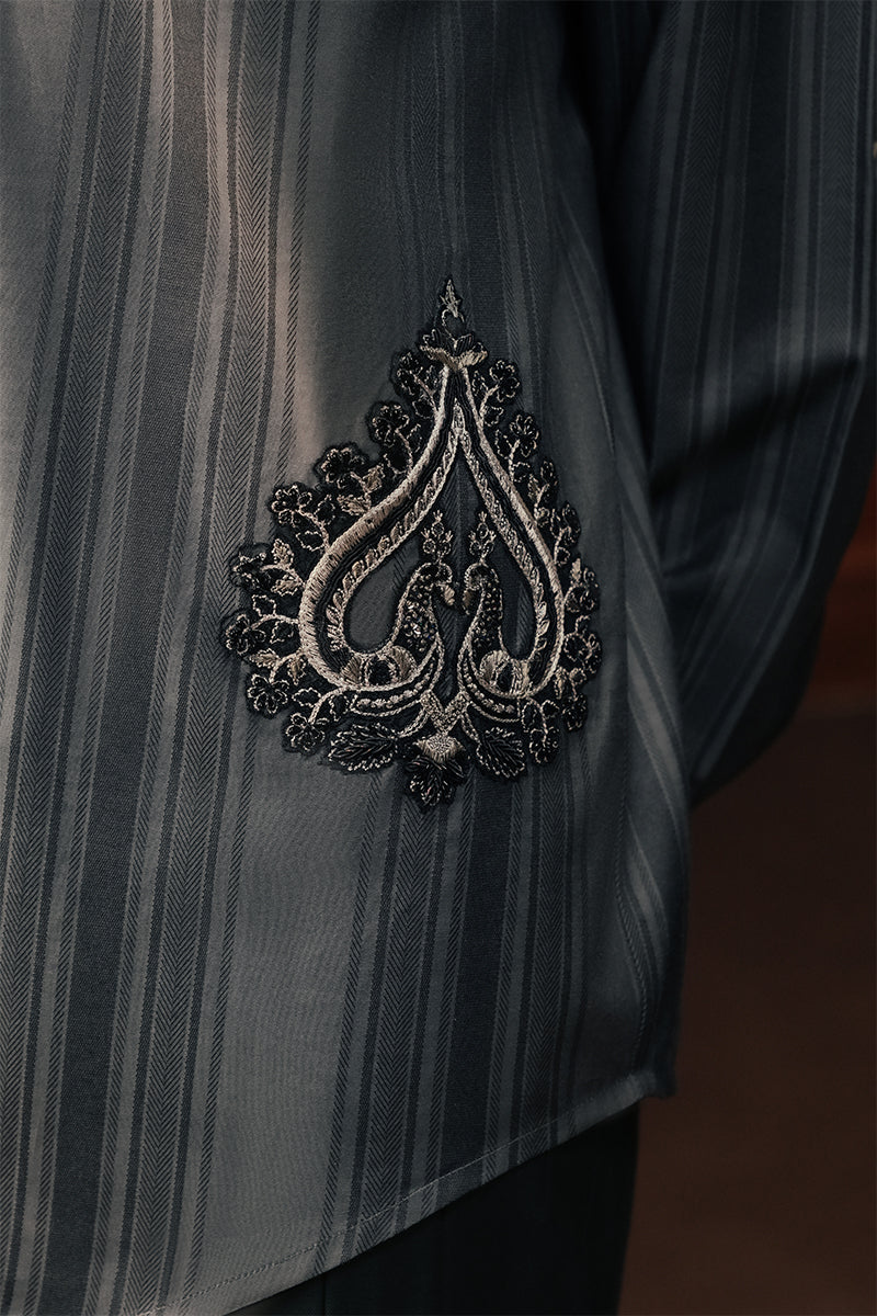 A refined essential elevated with hand embroidered detailing. An effortless buttoned shirt with Aomi’s signature “Peacock in Love” motifs richly embroidered and hand-embellished with beads, sequins, cutdana, and kora. To be worn both as a staple and a standout.