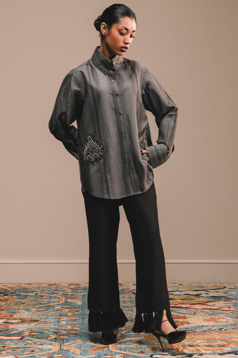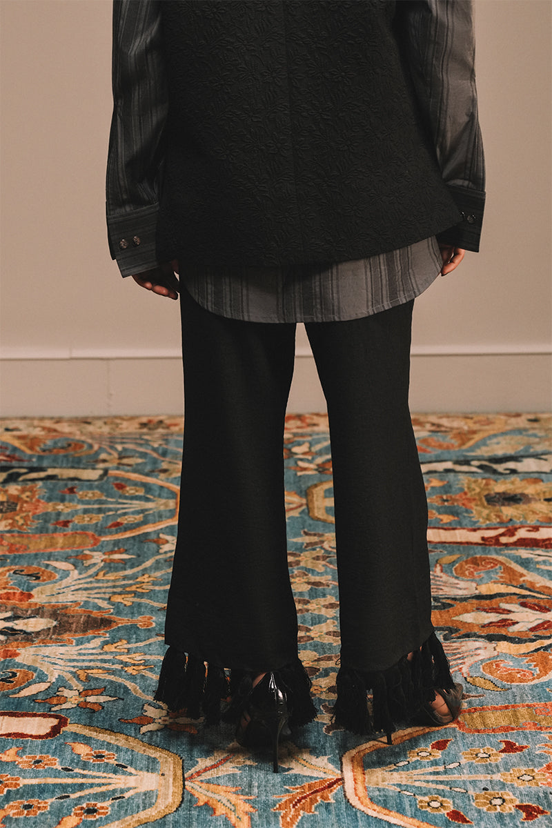 Bell-shaped trousers are crafted from breathable cotton silk in classic black. The silhouette flares gently from the knee, creating a soft volume and is further detailed with tassels at the bottom
