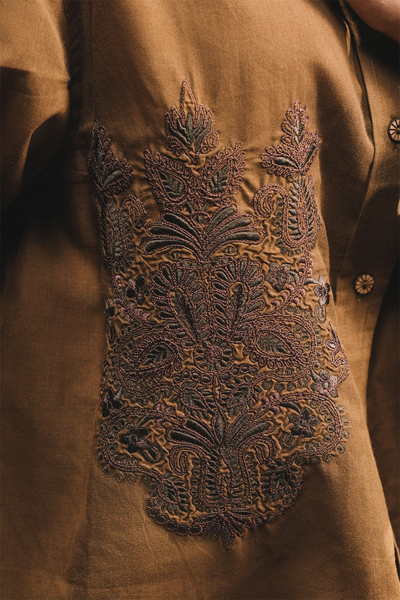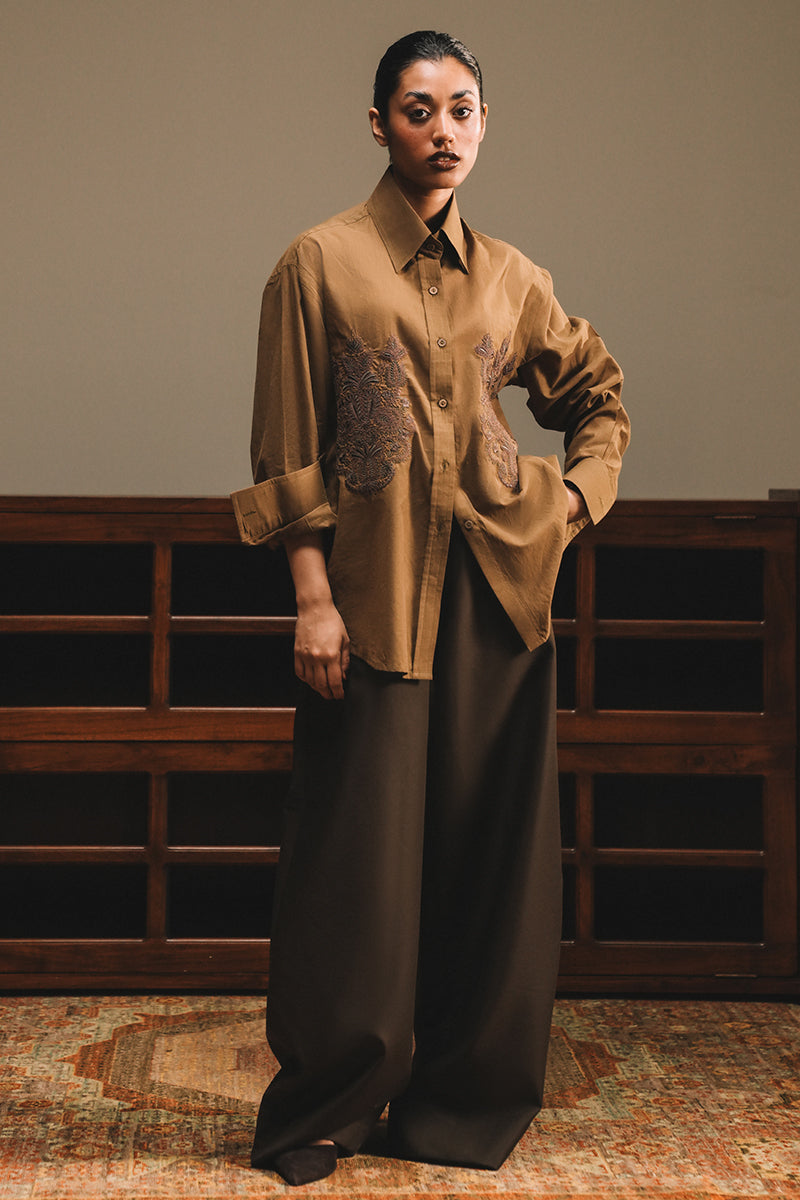 An effortless buttoned shirt in olive cotton, defined by hand-drawn, hand-crafted motifs. Cut with ease and fluidity, it carries a quiet balance of comfort and artistry.