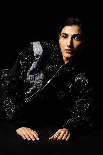 A carefully crafted, double-layered bomber jacket with jersey and chiffon layering. Detailed with iraghi stitches and print inspired by a culmination of the artist Jahanzaibay's art pieces. The male model is 188 cm / 6′1″ and wears a unisex size...