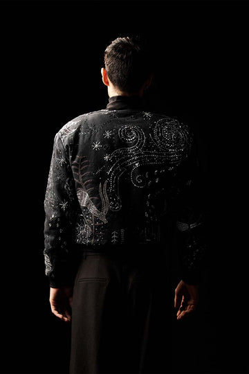 A tailored, handcrafted bomber jacket detailed with minimal embroidery along the panels and structured ribbing at the bottom.