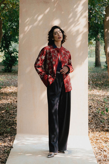 The effortless, relaxed cut jacket featuring a mandarin collar, concealed placket and pleated shoulder detailing showcases handworked floral and paisley patternwork accentuated with further hand embellished detailing. The jacket lining features a vintage hand-block motif sourced from Skardu, Pakistan Hand...