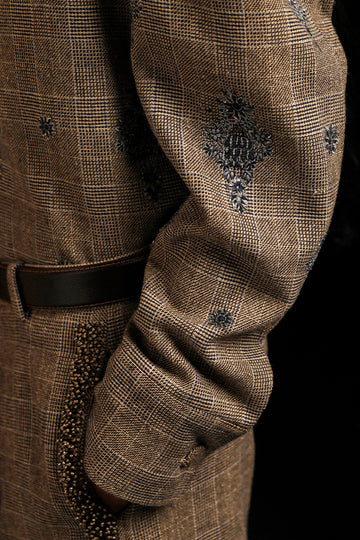 This checkered jacket, rendered in soft beige and white hues, is elevated by a dark chocolate collar that anchors the silhouette in bold contrast. All-over floral embroidery in earthy greens and blues lends depth, subtly illuminated with hand embroidered beadwork...