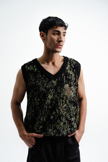 Jacquard woven knit sweater-vest with a v-neckline and ribbed detailing. Featuring floral jacquard patterns and a logo on jamawar patch detailing. Studio made woven jacquard knit Jacquard floral pattern Patchwork jamawar logo Relaxed fit Ribbed detailing Colour: Green and Black,...