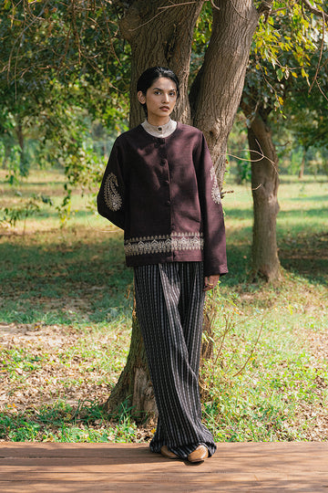 The effortless and timeless Ardh jacket, intricately embroidered with paisley and spiral motifs cut for a relaxed yet tailored feel.