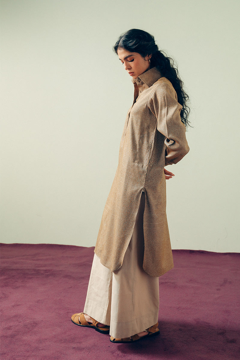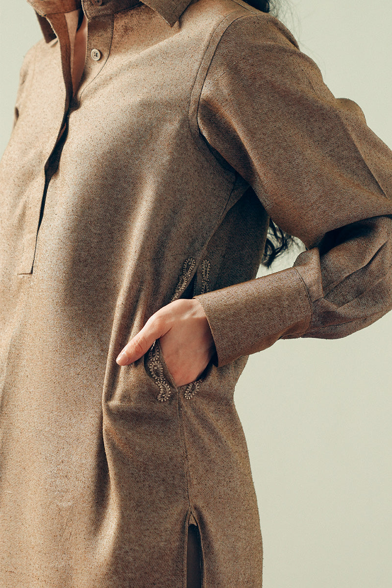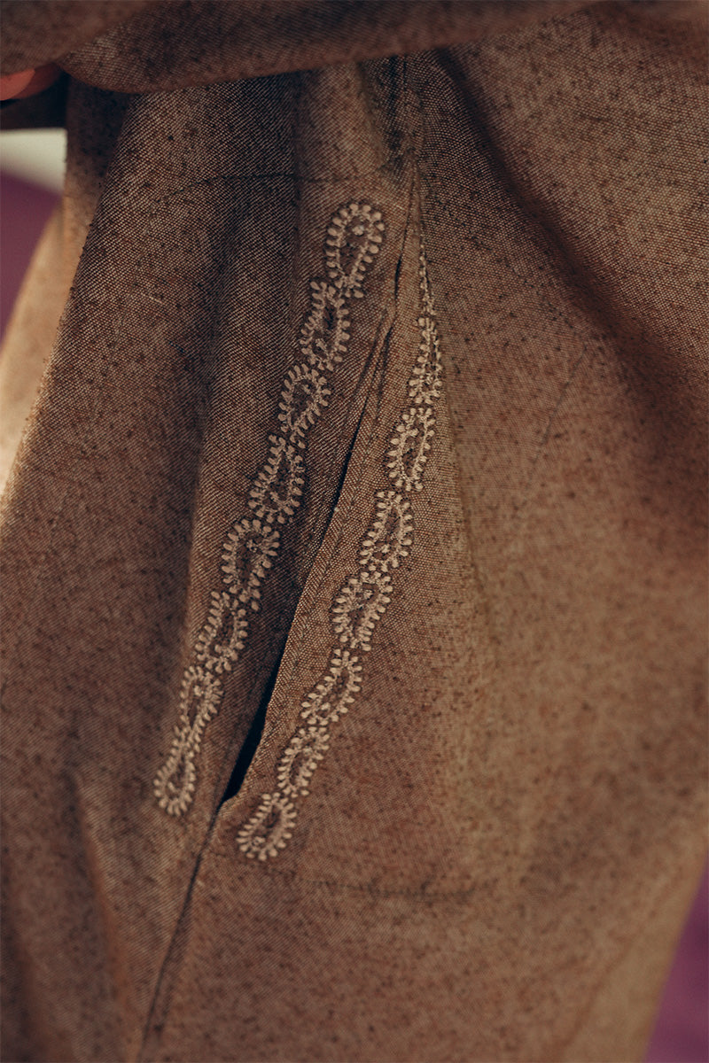The Kaml Kurta Shirt and Trouser Set hand-dyed in Multani Karandi Silk and tailored for a loose fit with paisley embroidery on the side pockets, paired with a cream white loose fit trousers.