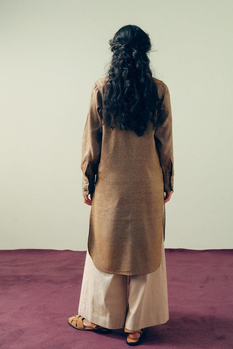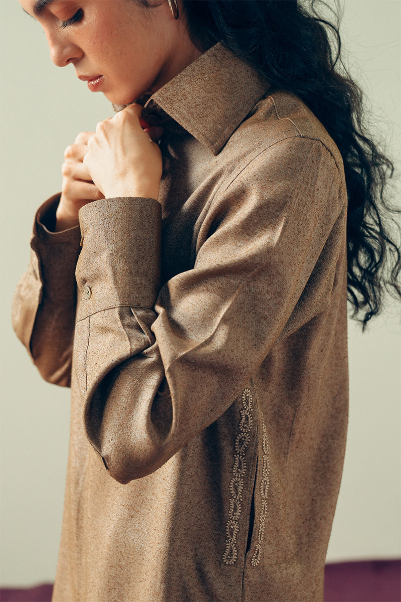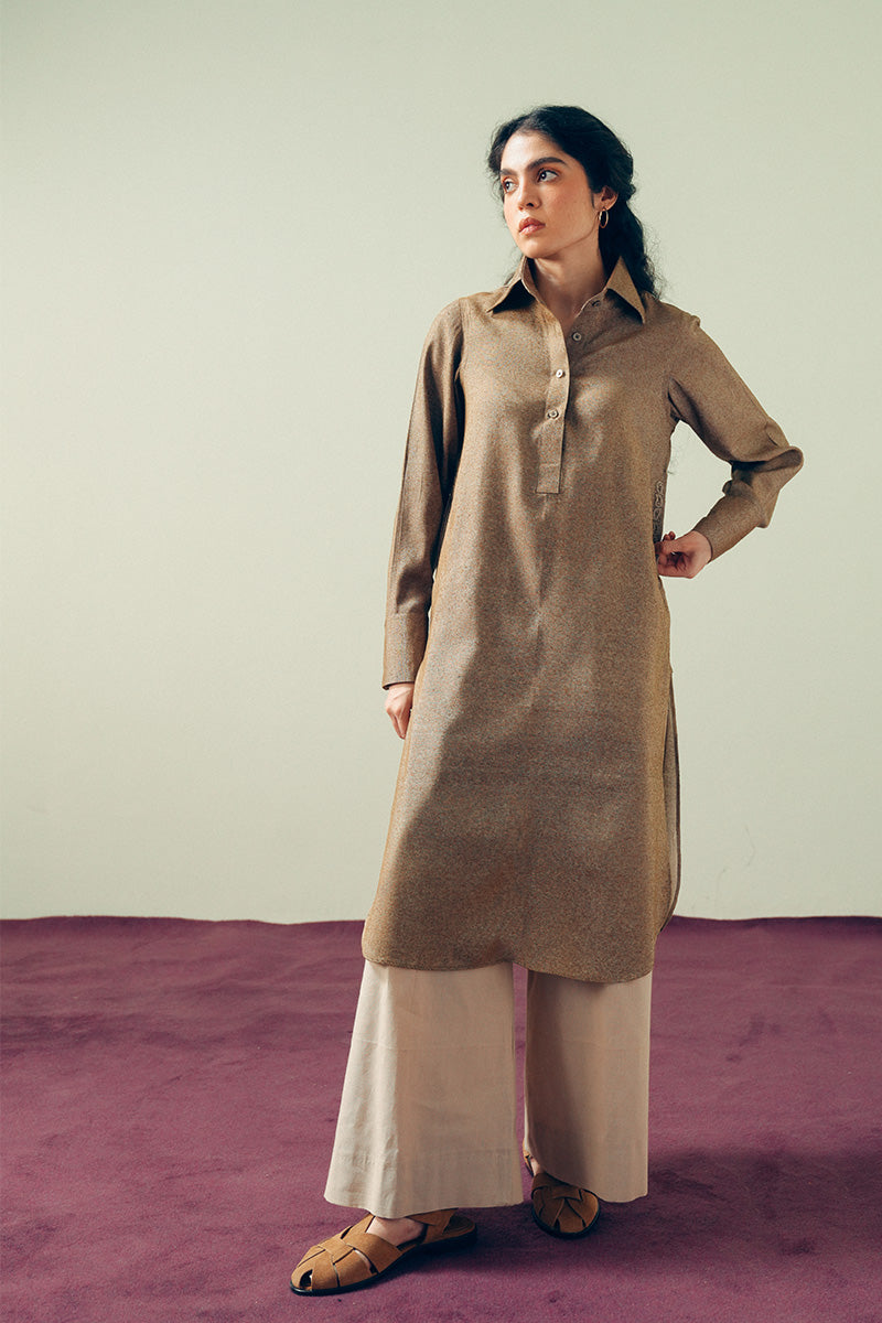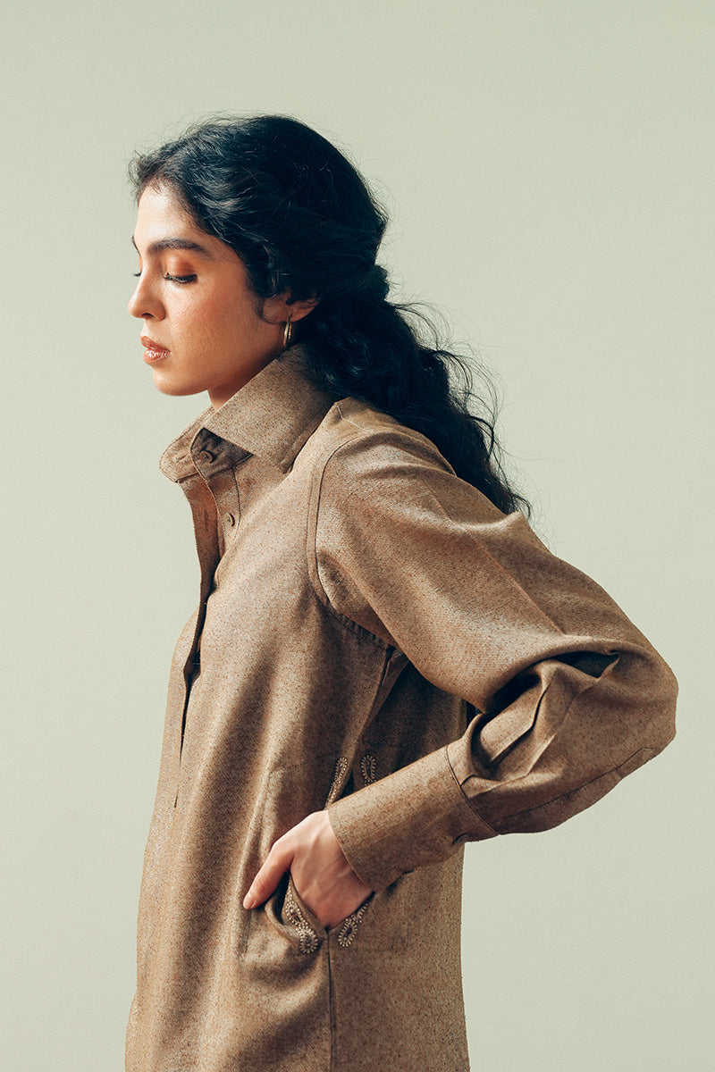 The Kaml Kurta Shirt and Trouser Set hand-dyed in Multani Karandi Silk and tailored for a loose fit with paisley embroidery on the side pockets, paired with a cream white loose fit trousers.