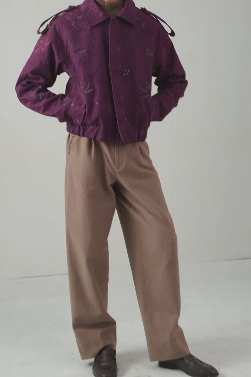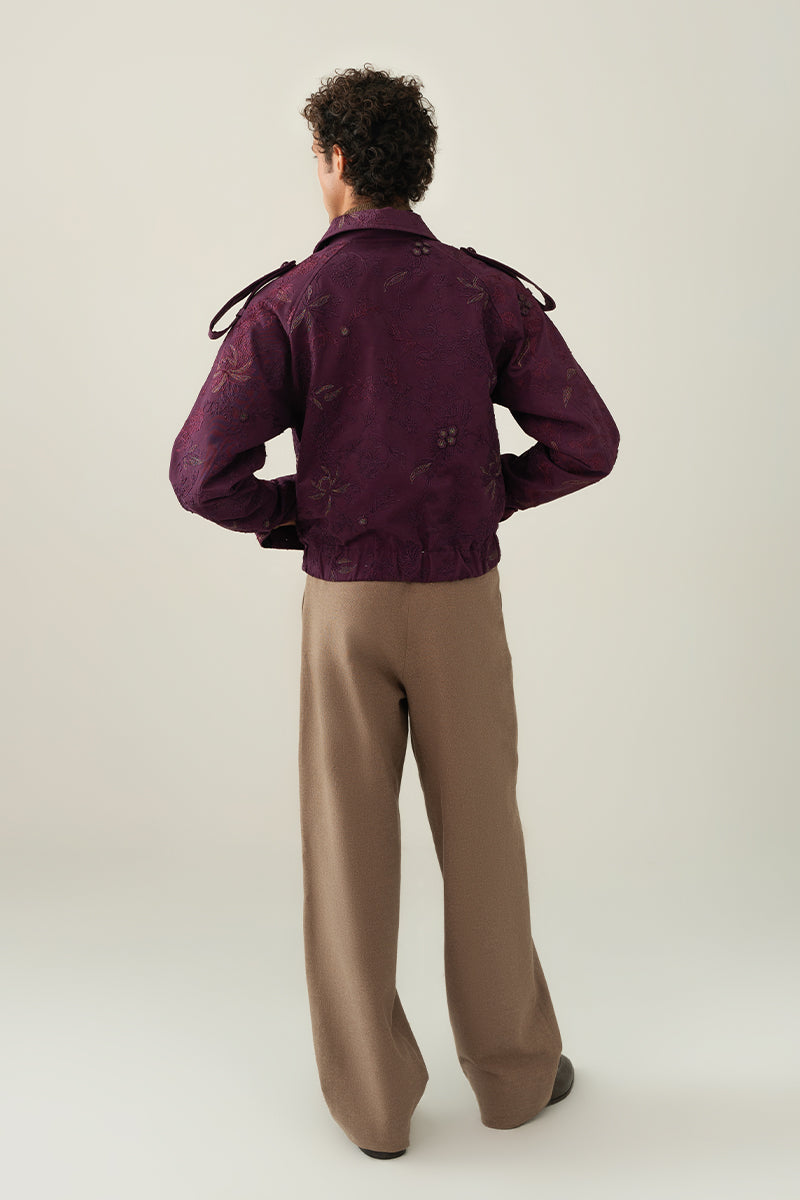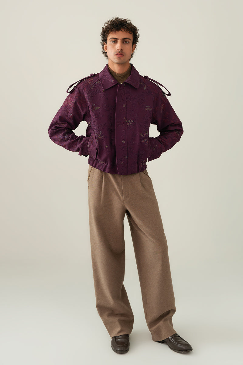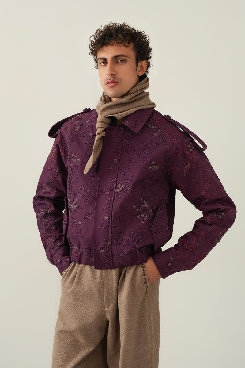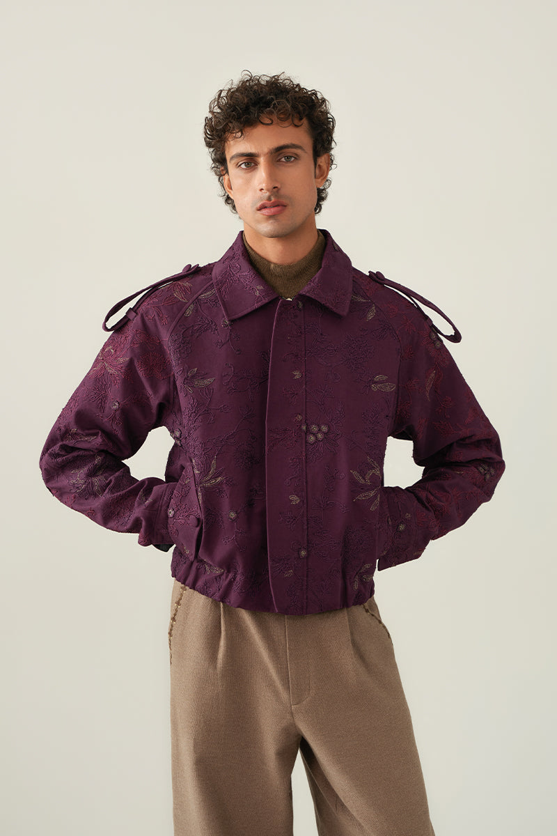 A plum toned structured jacket finished with tone-on-tone dori embroidery and subtle 3D floral detailing. Designed with raglan sleeves for a relaxed yet structured fit, and an elasticated hem that defines the modern silhouette.