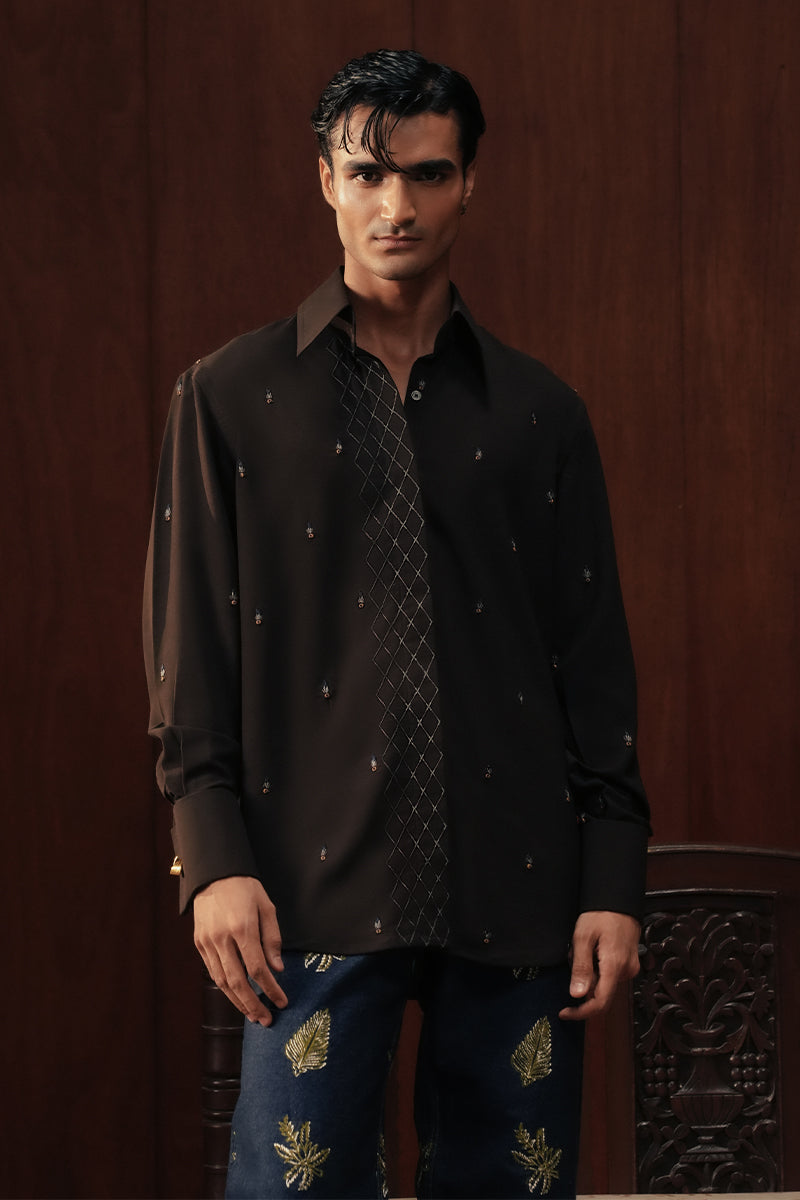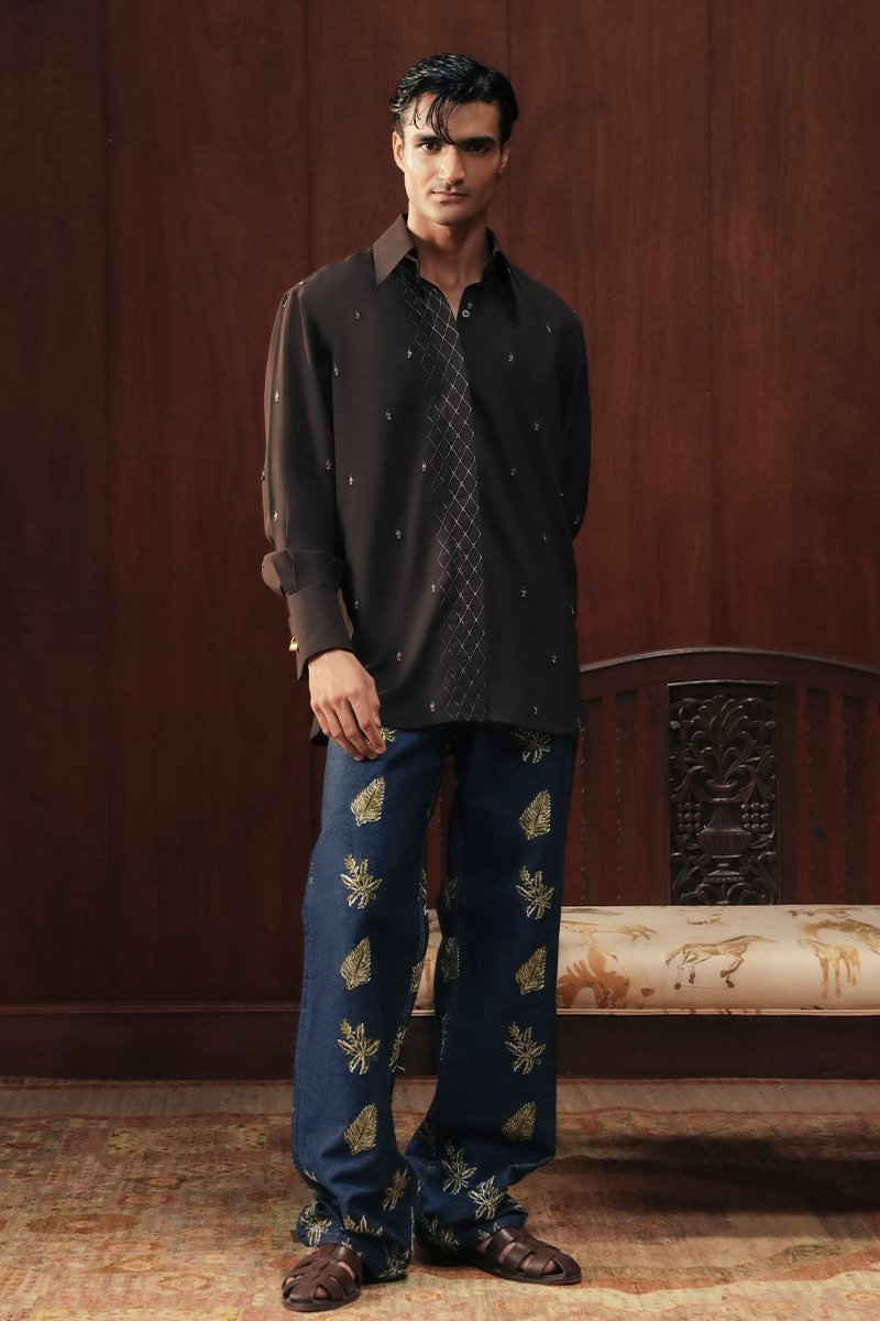 A tuxedo-inspired shirt in chocolate-toned silk, elevated with intertwined hand embroidery and scattered detailing in wooden sequins and fine threadwork. Finished with a concealed placket, structured collar, and double cuffs, it distills South Asian craft into a sharp, contemporary form.