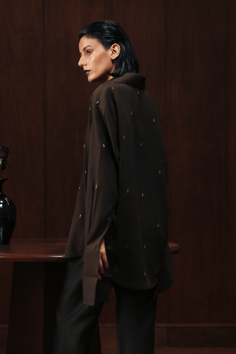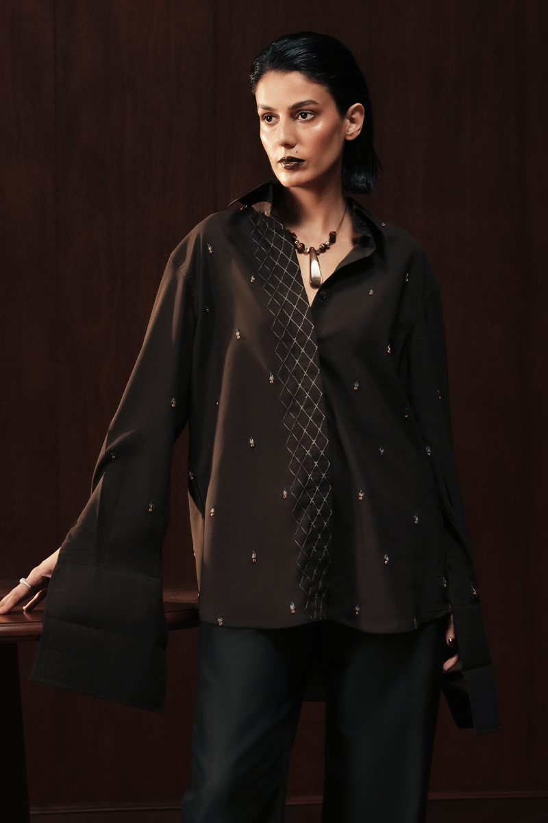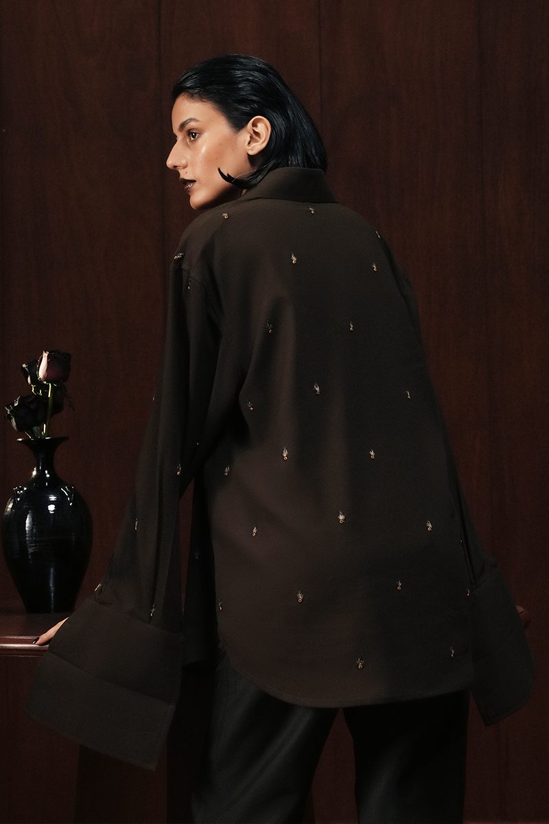 A tuxedo-inspired shirt in chocolate-toned silk, elevated with intertwined hand embroidery and scattered detailing in wooden sequins and fine threadwork. Finished with a concealed placket, structured collar, and double cuffs, it distills South Asian craft into a sharp, contemporary form.