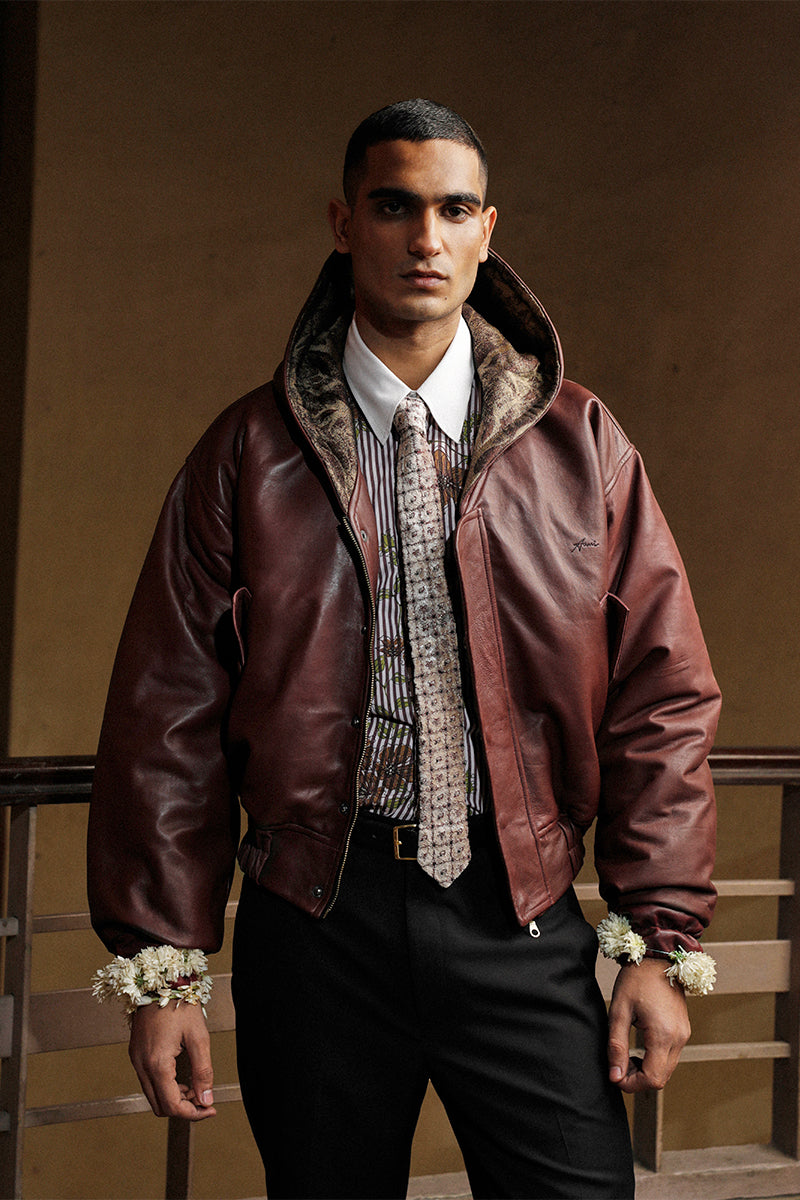 Alternative leather hoodie-jacket in a rich burgundy shade with matching ribbed cuffs and belt. The hoodie features a large embroidered 'champa' flower at the back and luxurious jamawar lining that peeks through the hood.