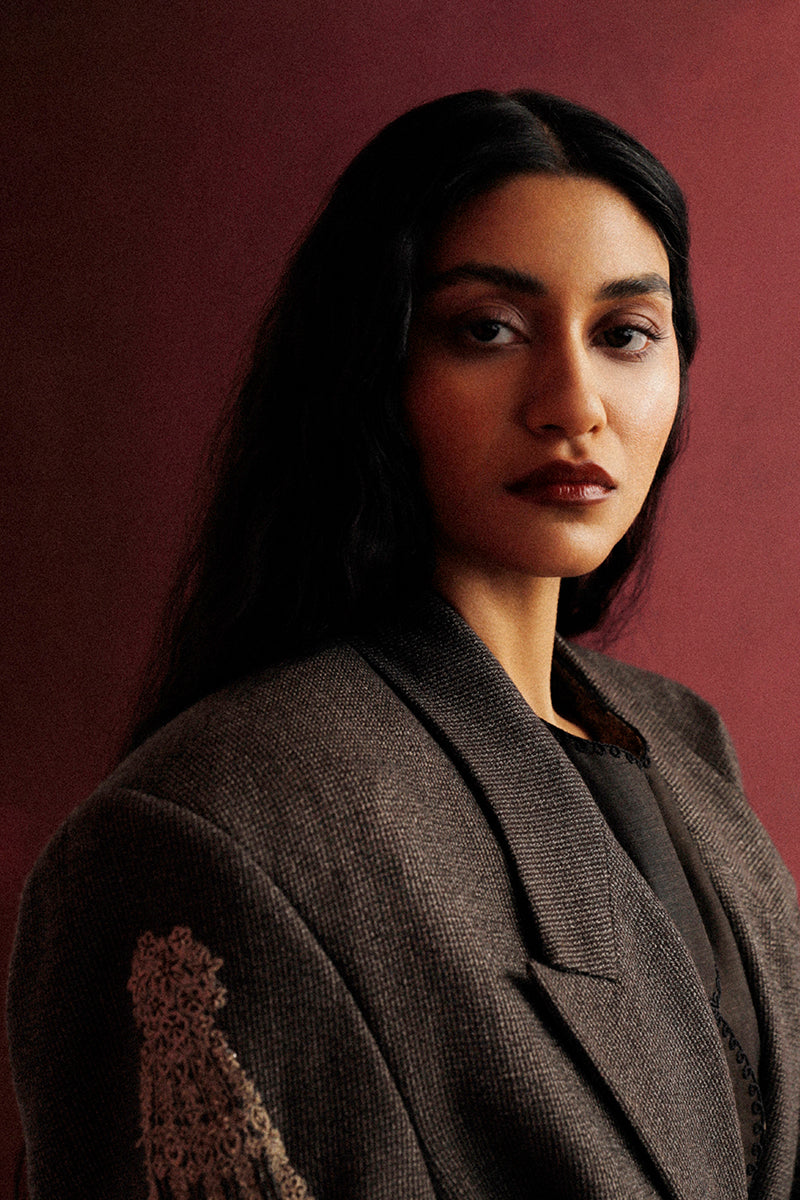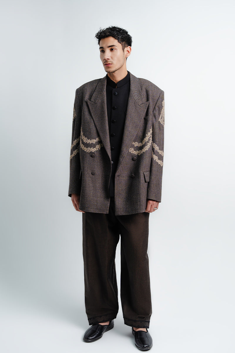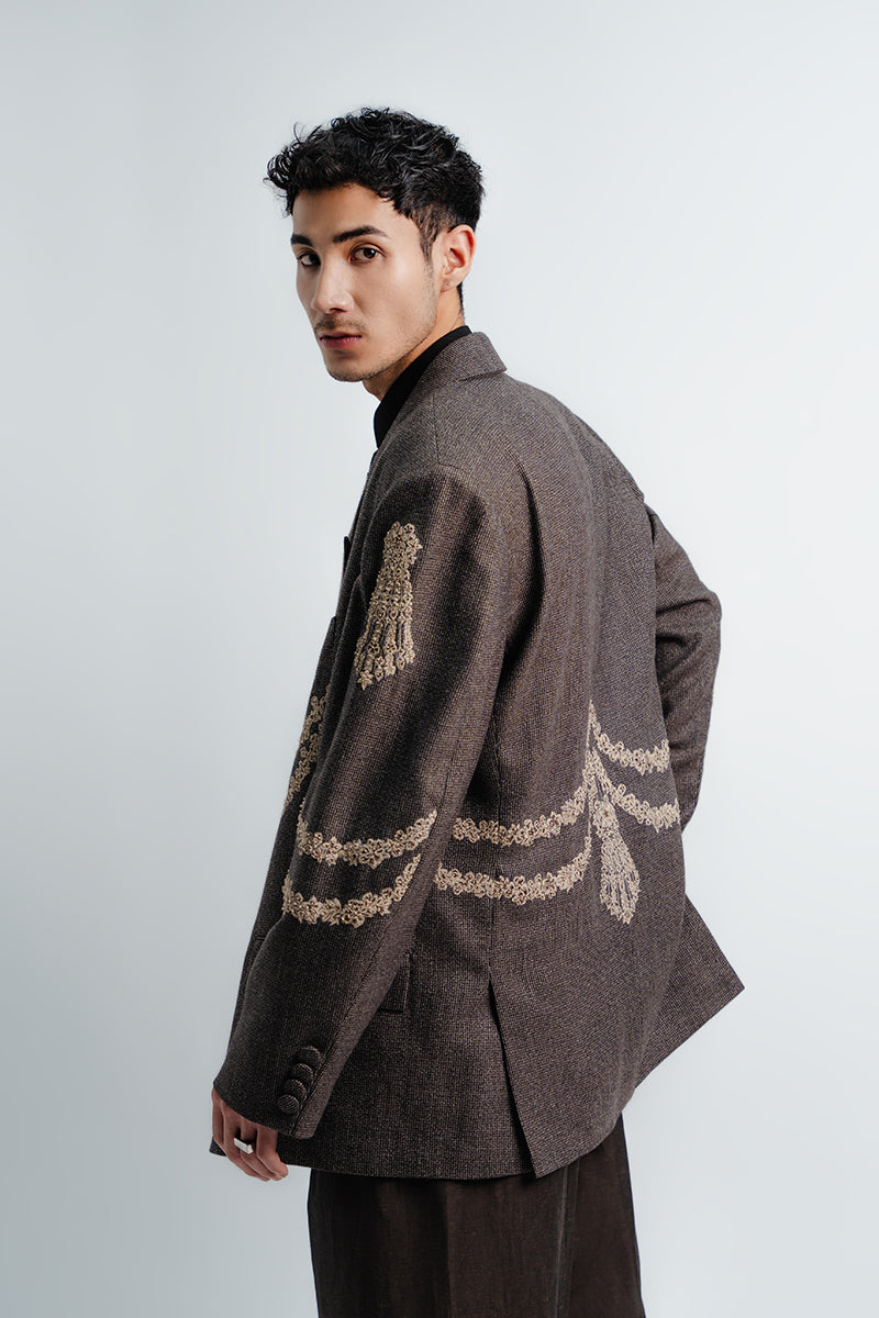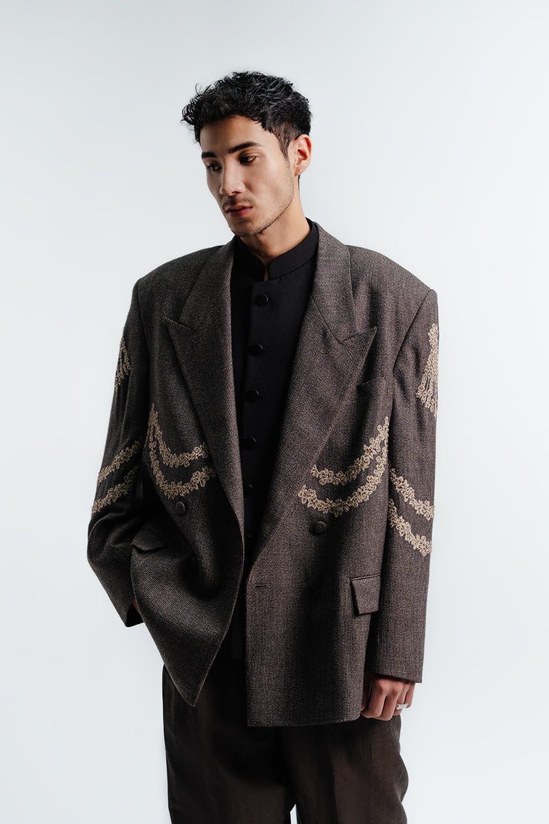 Relaxed fit textured grey-toned single-breasted blazer in an Italian Super140 fabric showcasing delicate embroidered 'motia’ floral motifs arranged in the form of a jewel piece.