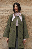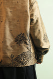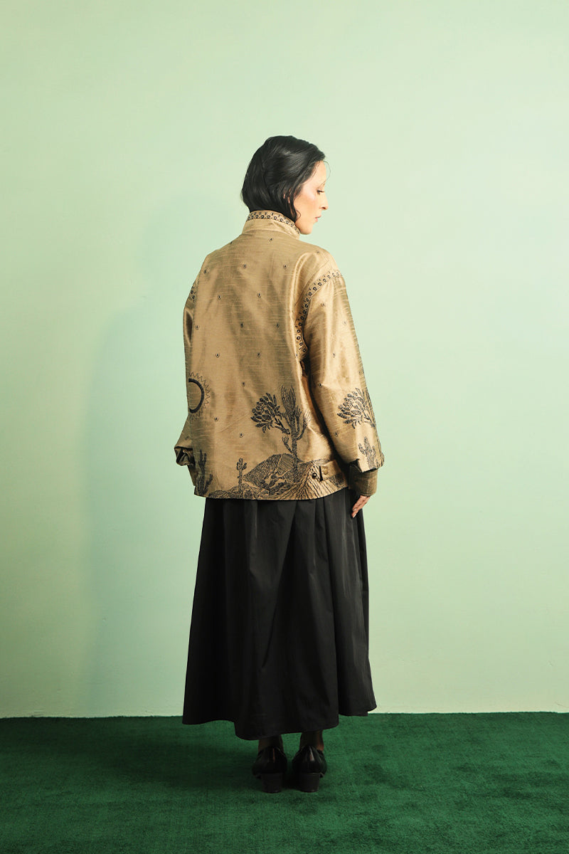 Earthy-olive toned fine raw silk lightweight jacket adorned with hand drawn embroidery showcasing elements inspired by Aomi's mystic jungle. Cut for a relaxed fit.