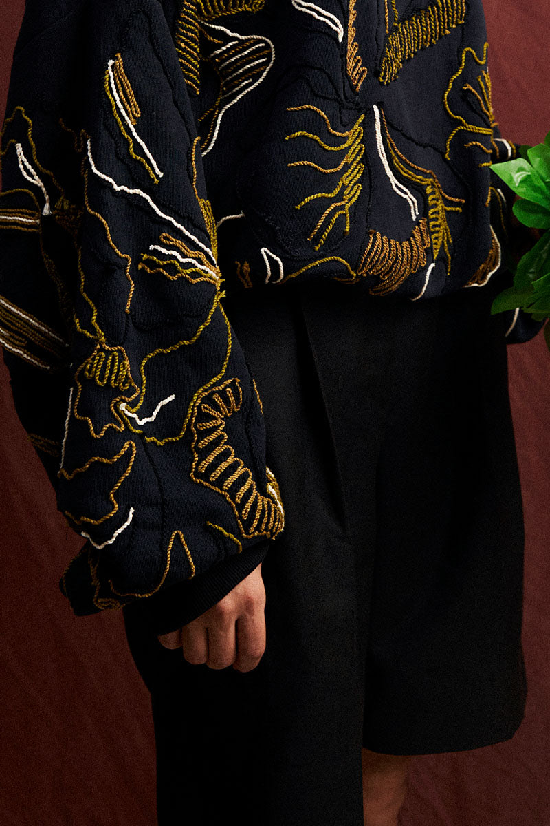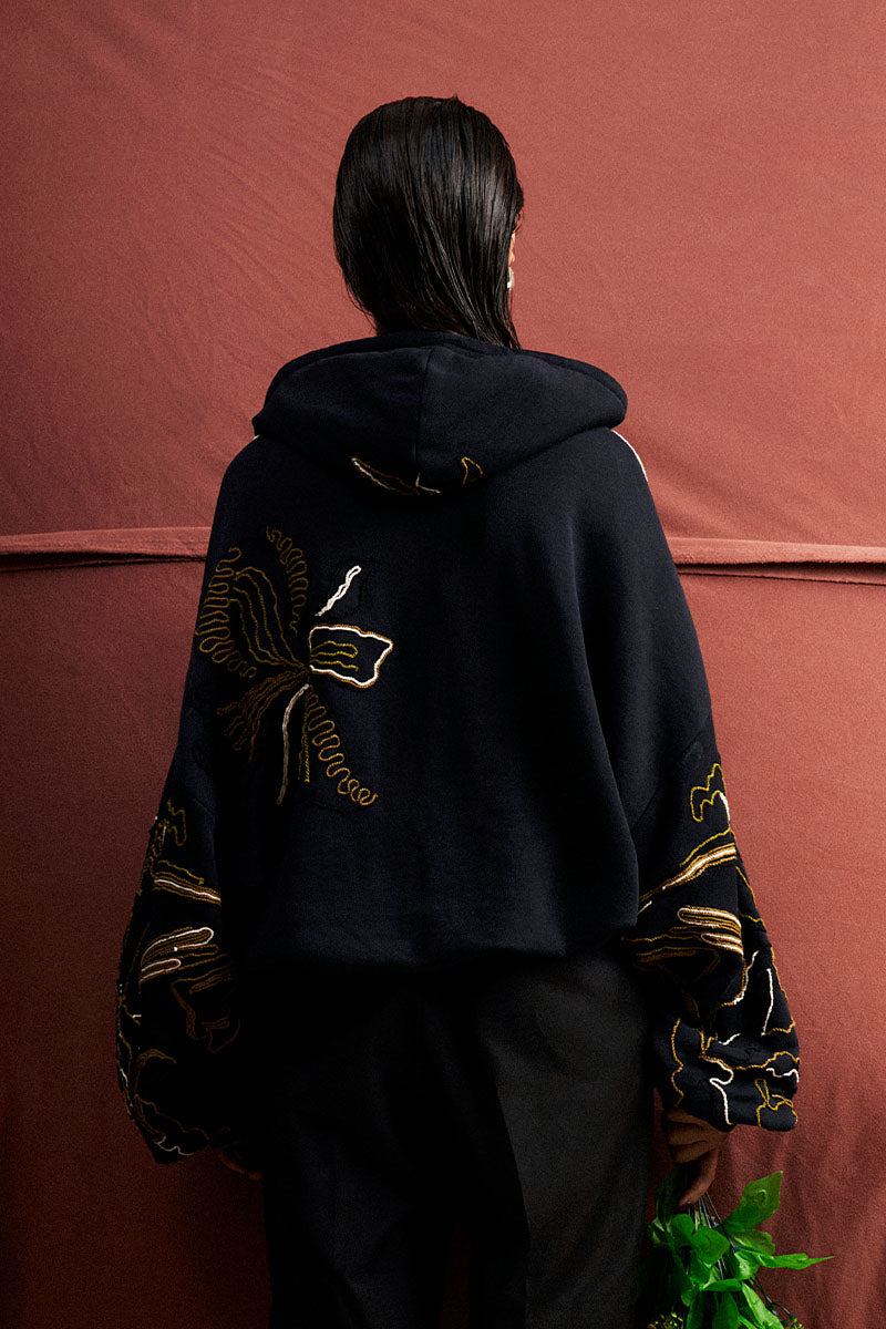 'Relaxed fit black hoodie with extensively worked 'dori' embroidery representing abstract floral patterns. The hoodie is cut for an oversized fit with ribbing at the bottom.