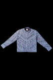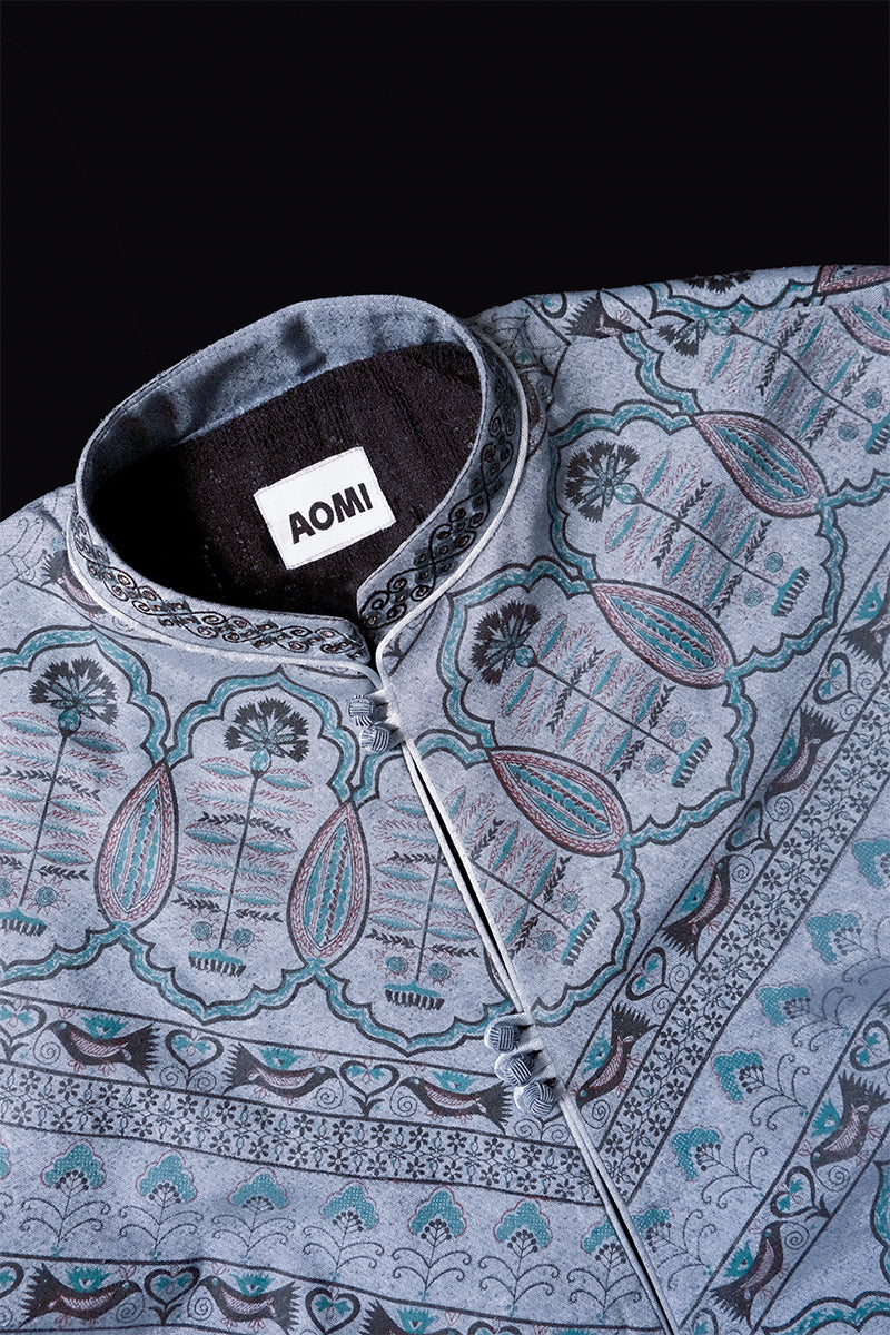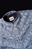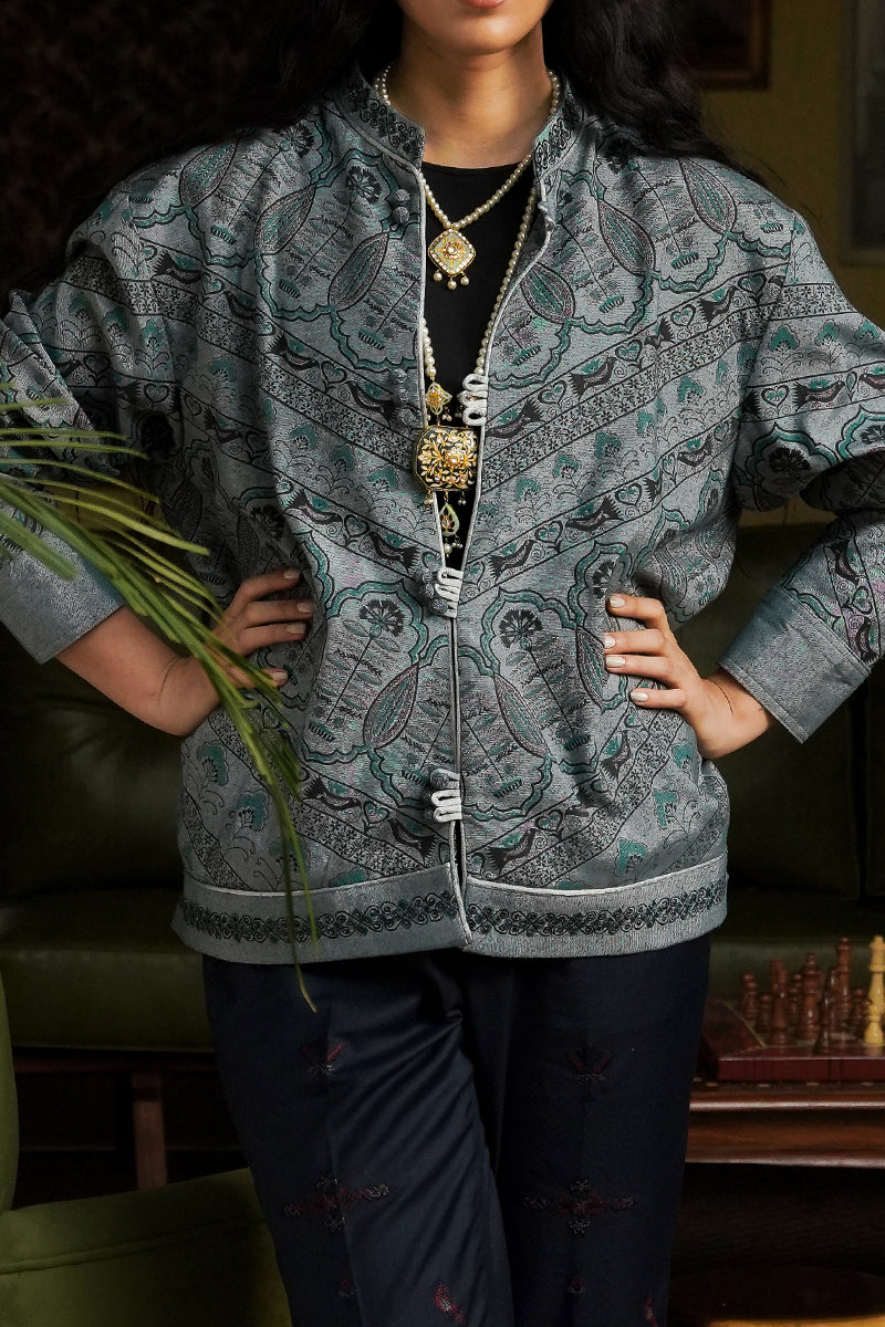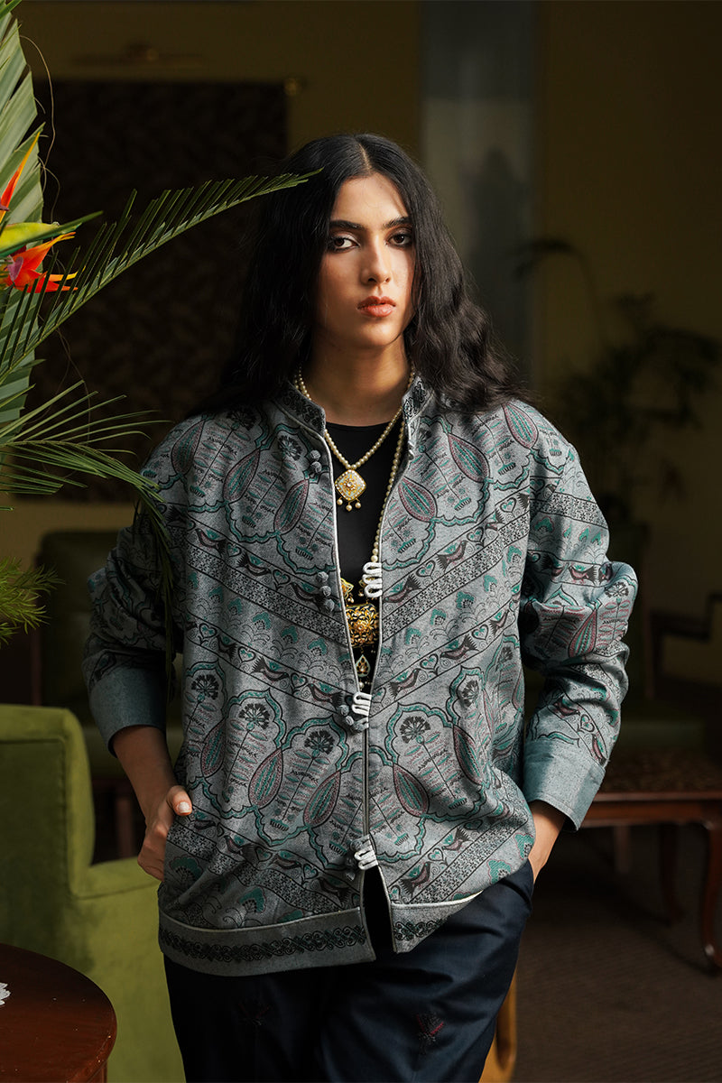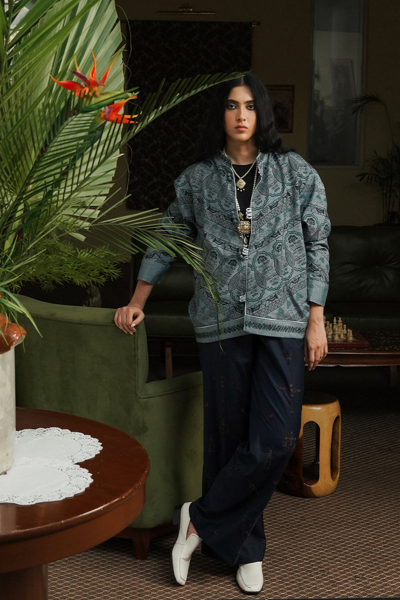 Relaxed, lightweight shacket in a luxurious khaddar silk fabric with hand-drawn patterns beautifully screen-printed. Further detailed with contrasting borders and front loop button closures.