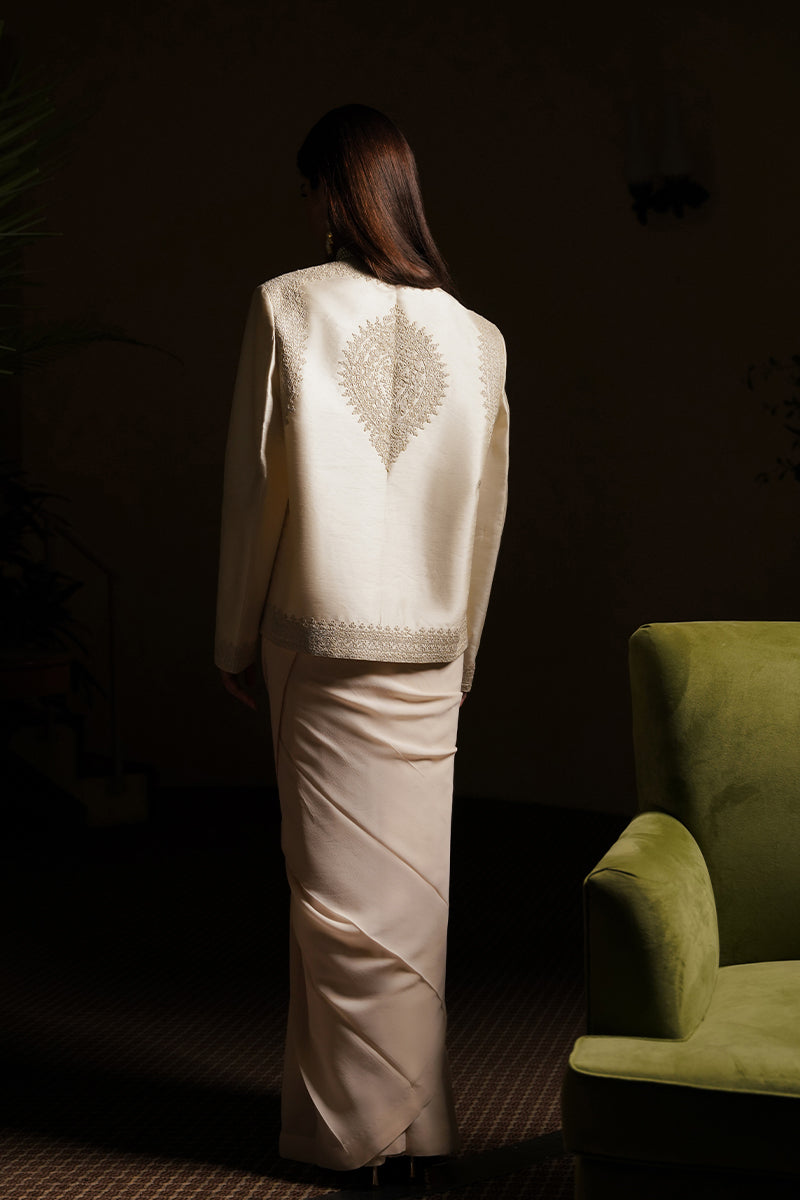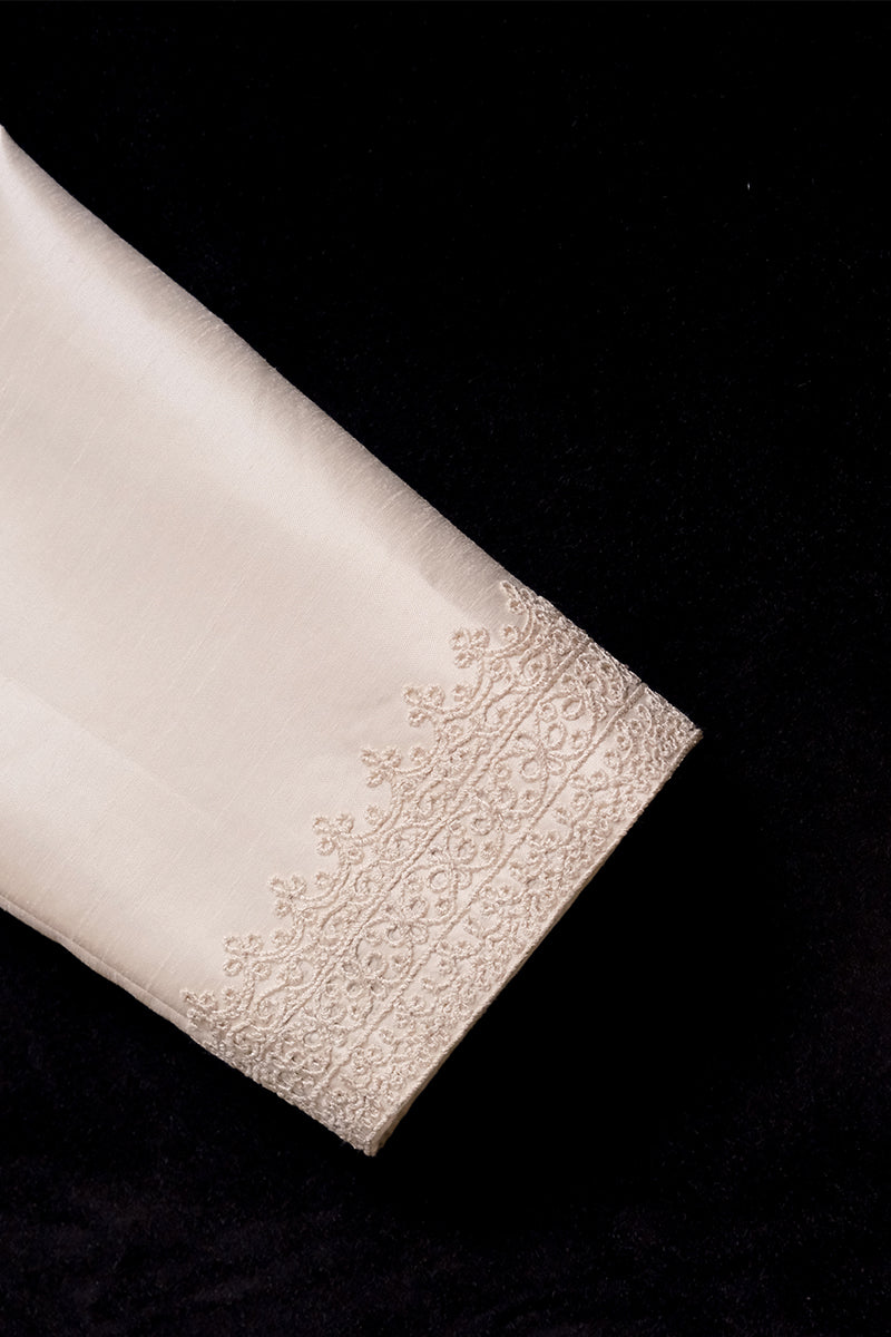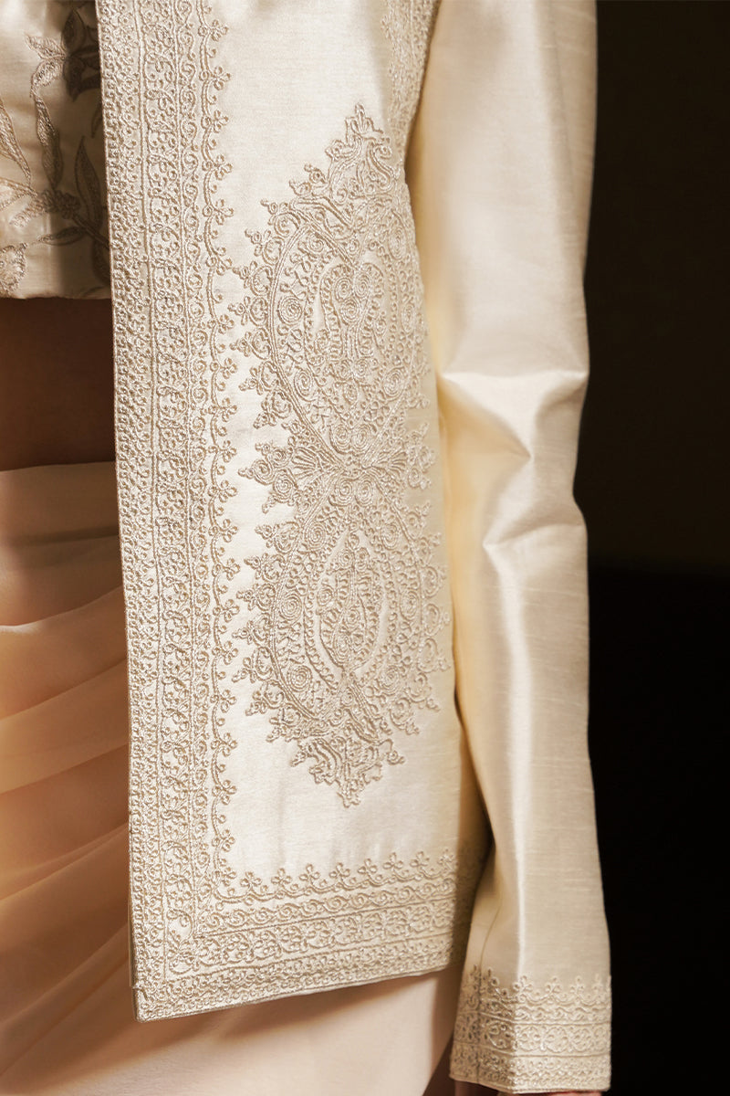 An intricately crafted, tailored structured jacket in a luxurious raw-silk fabric embellished with tone on tone, hand-drawn, dori embroidery on the front and the back.