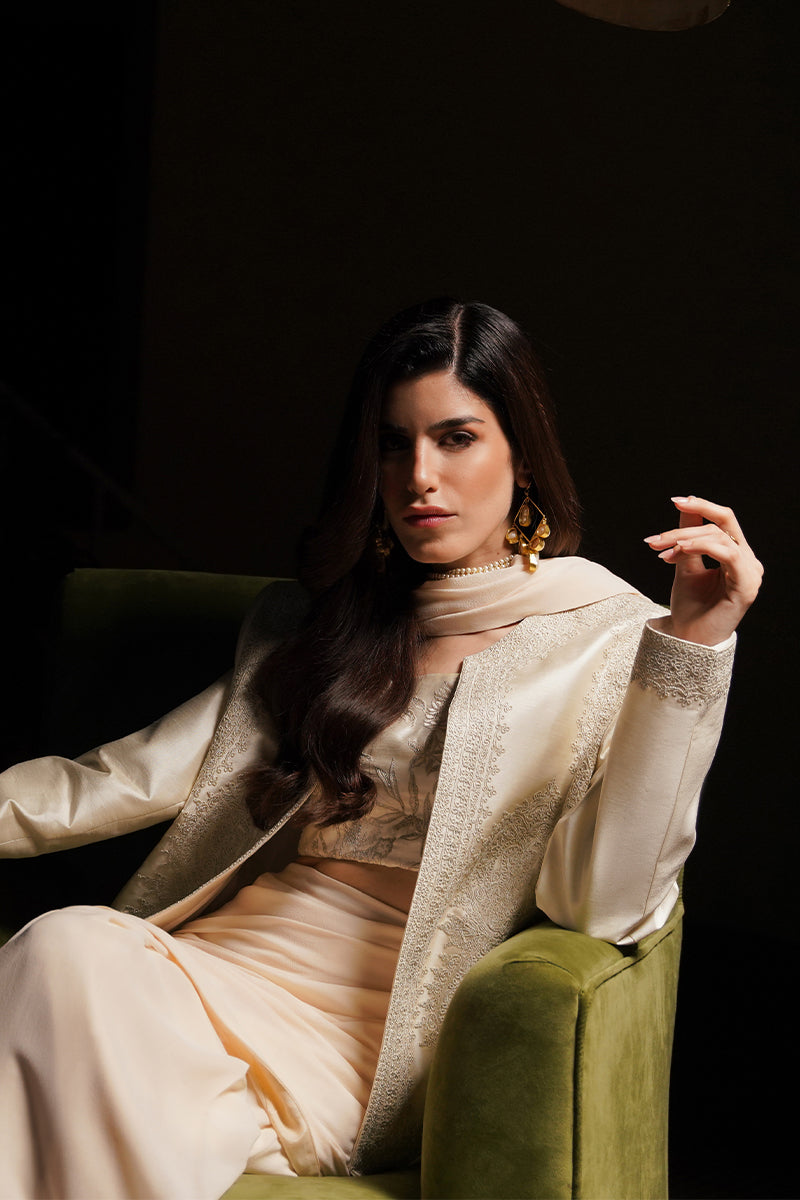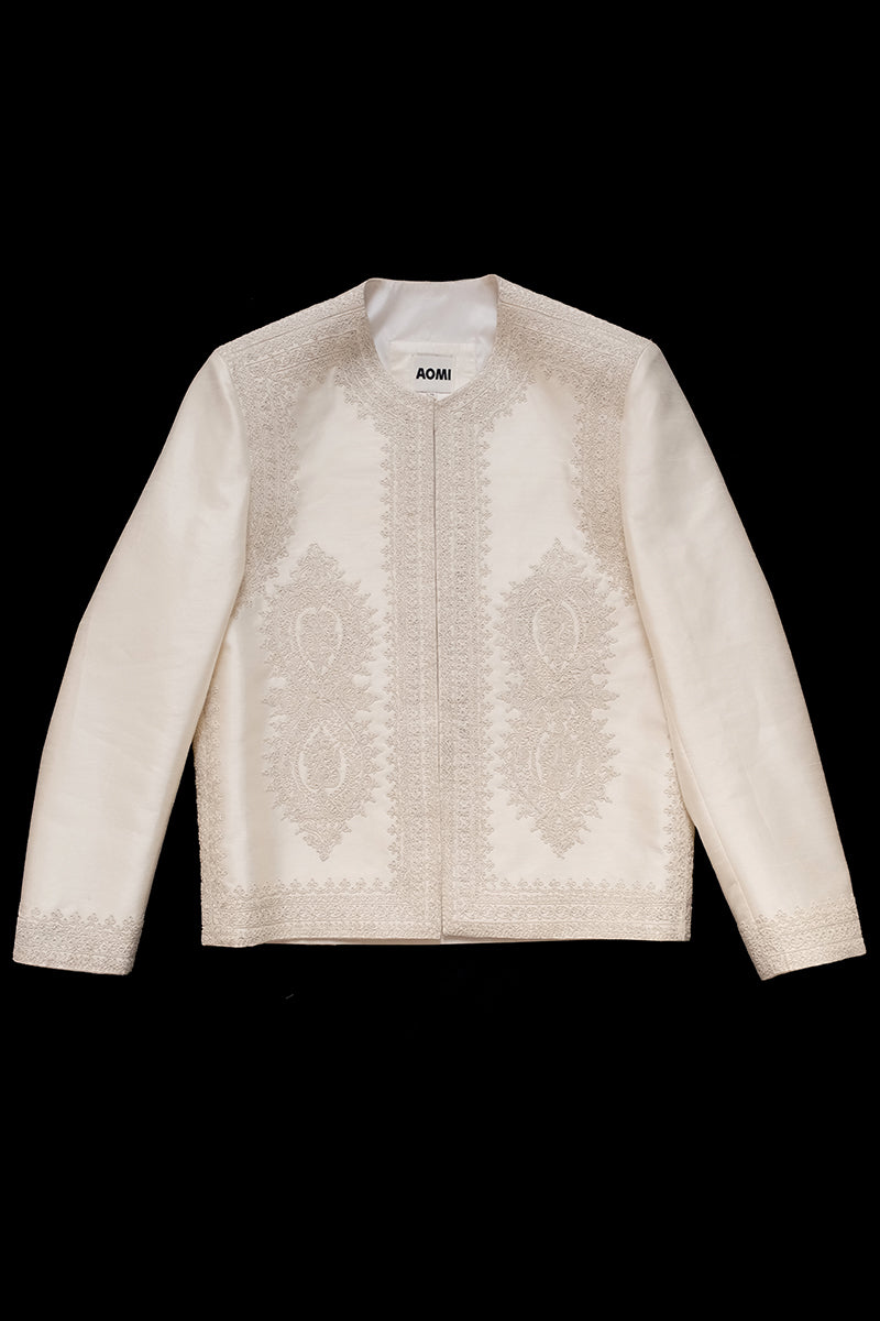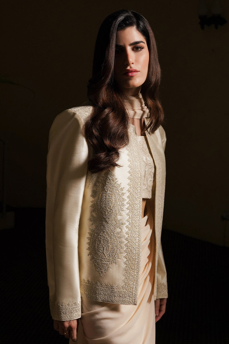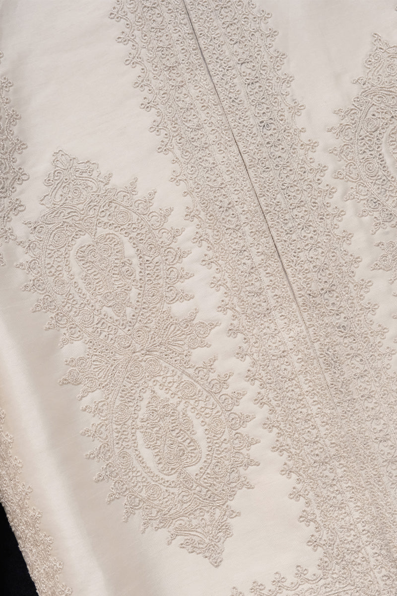 An intricately crafted, tailored structured jacket in a luxurious raw-silk fabric embellished with tone on tone, hand-drawn, dori embroidery on the front and the back.