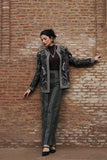 Earthy-olive toned fine raw silk lightweight jacket adorned with hand drawn embroidery showcasing elements inspired by Aomi's mystic jungle. Cut for a relaxed fit.