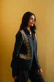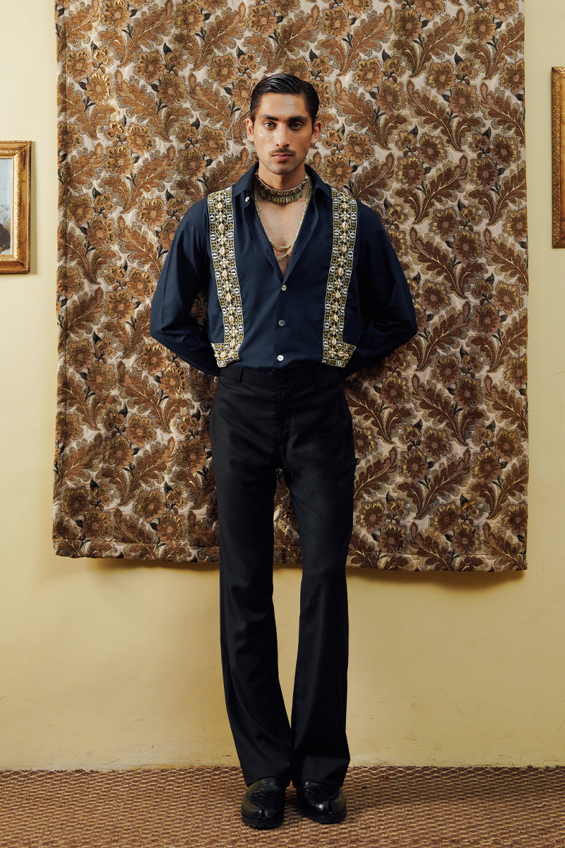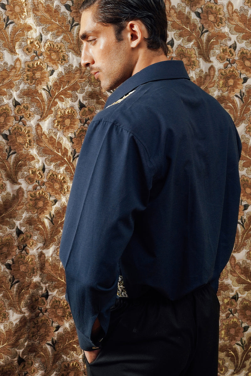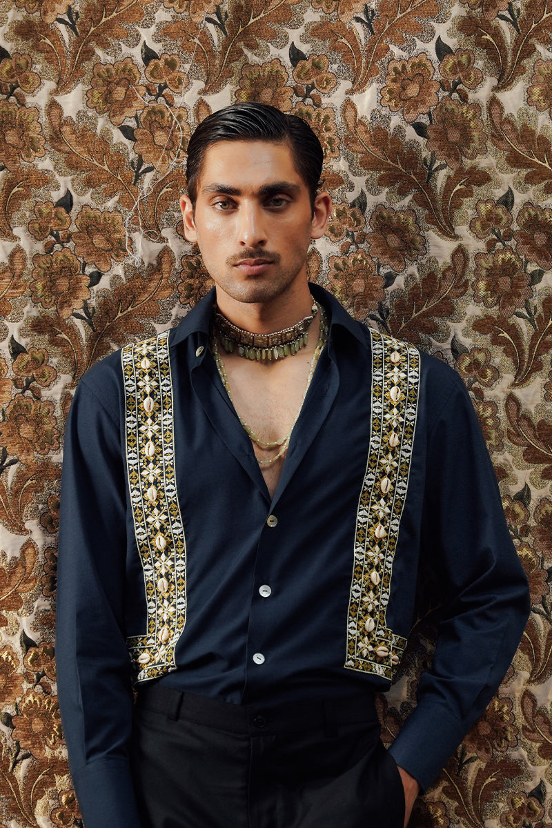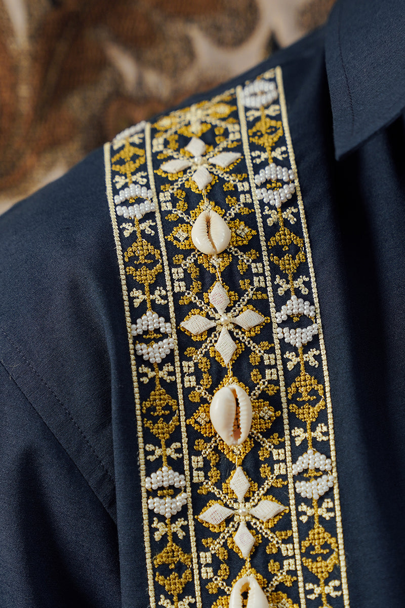 A tailored navy blue button-up shirt, detailed with cross stitch embroidery on panels, further accentuated with hand embellished pearls and sea shells with contrasting buttons.