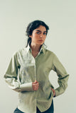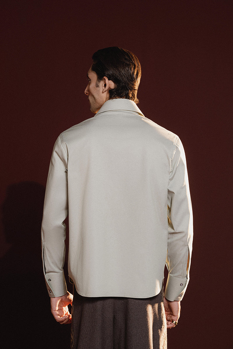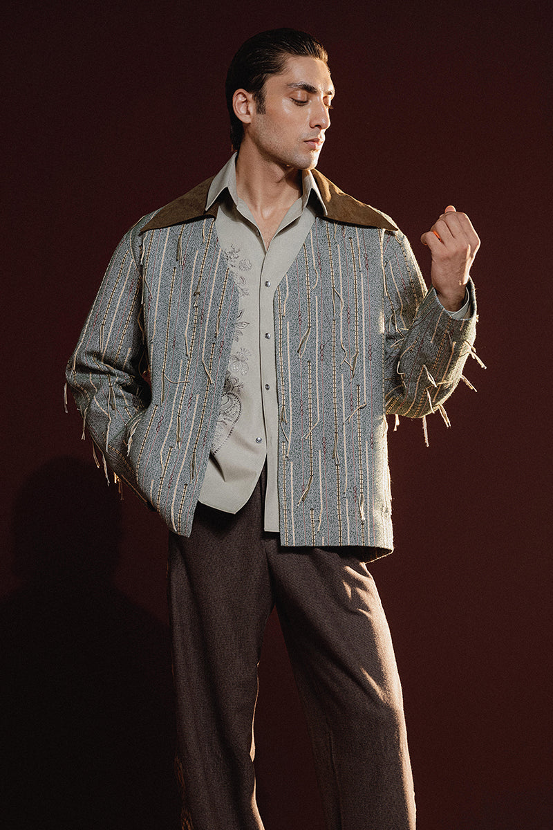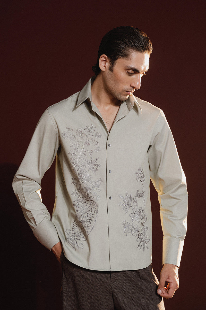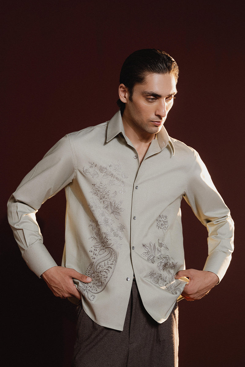 A tailored buttoned shirt with monotone embroidery depicting hand-drawn motifs inspired by south Asian elements.