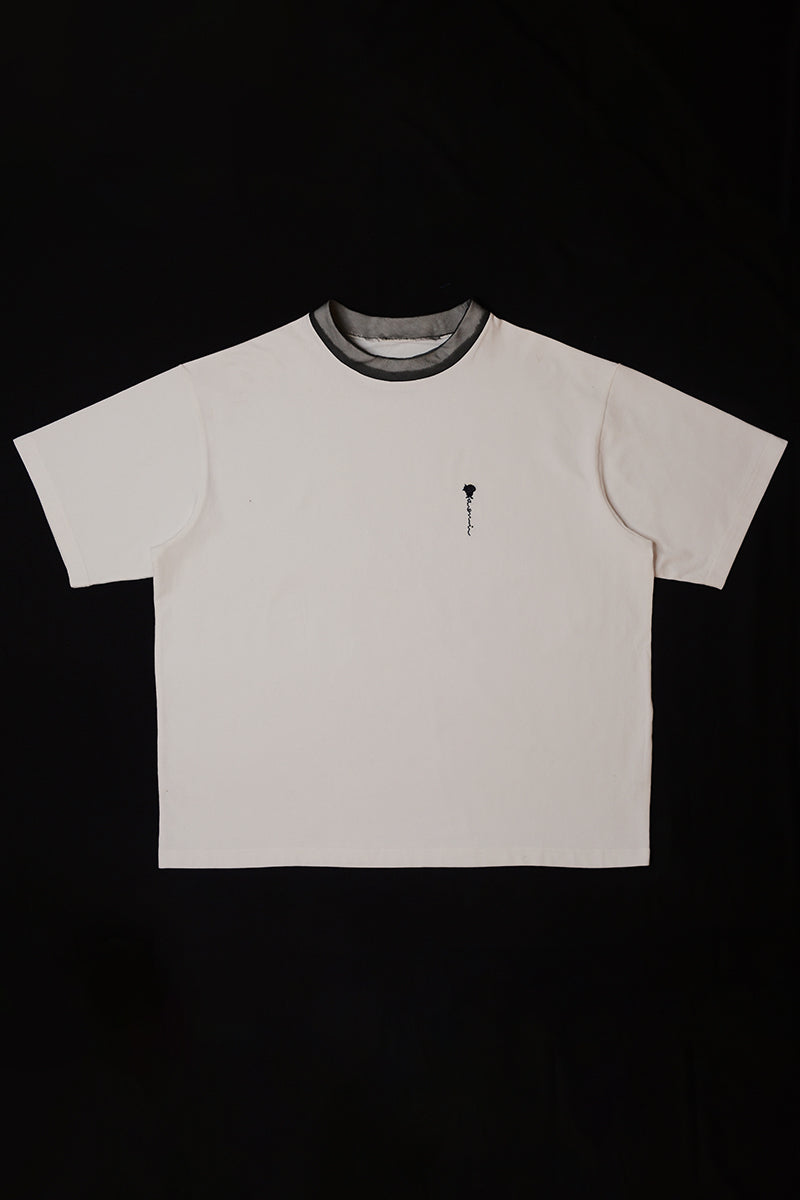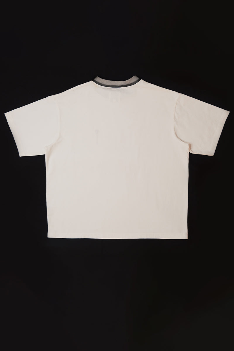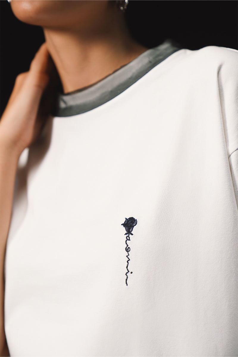 The Kaia t-shirt is an elevated take on a classic essential, cut for a boxy, relaxed feel in a cotton jersey fabric, detailed with the hand-crafted Aomi logo and a minimal organza collar.