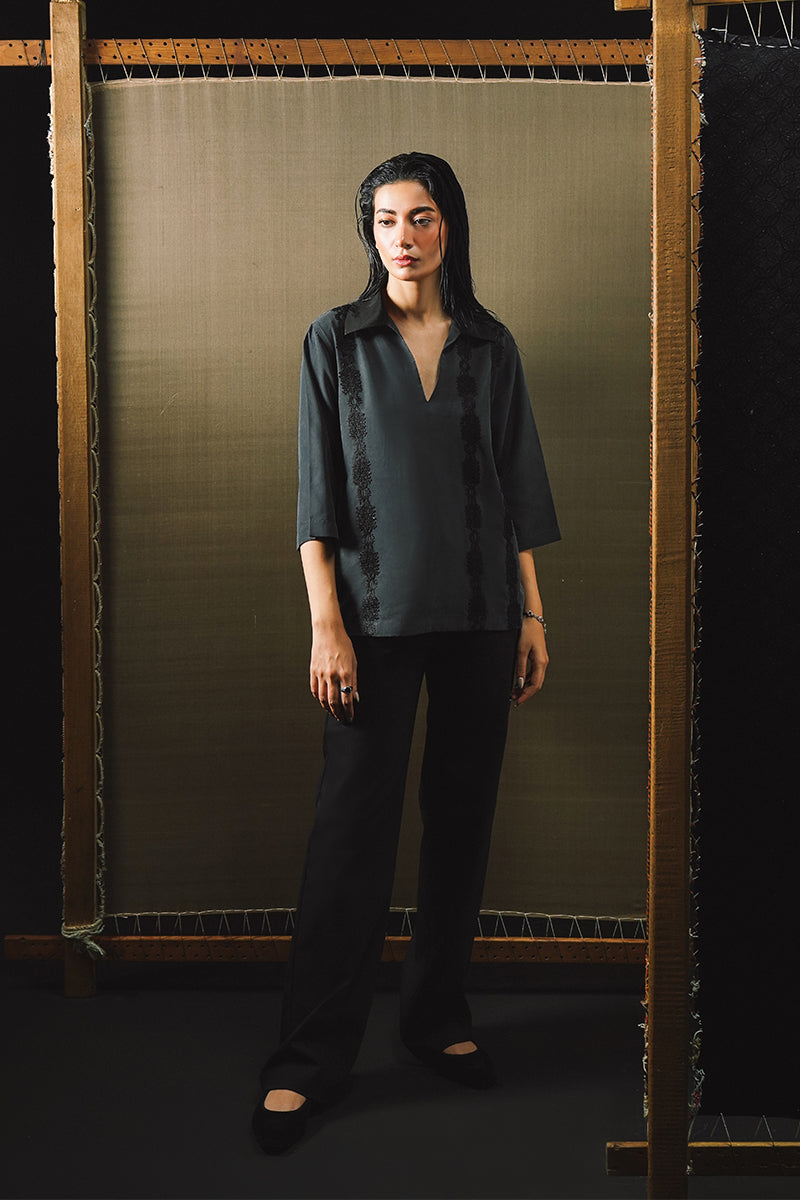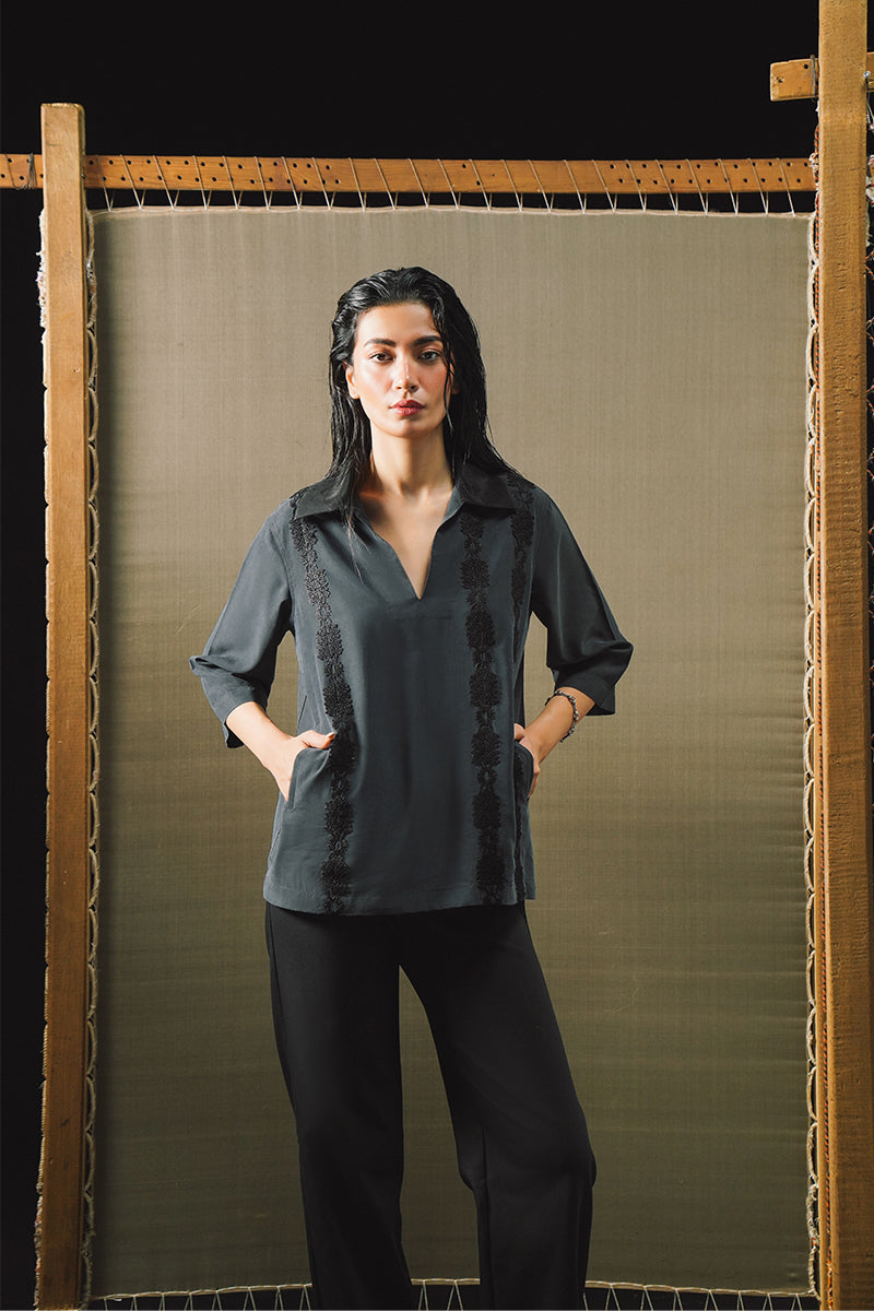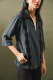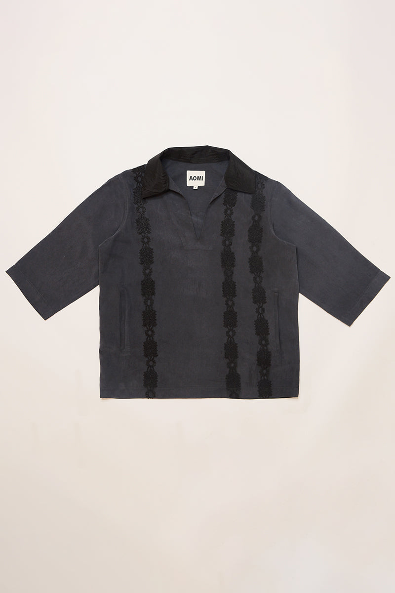 The Nile Polo is uniquely crafted allowing it to effortlessly float over the body. Nile features a contrasting collar in an organza fabric and lace detailing that has been hand-drawn and hand-cut before being sewn onto the shirt.