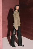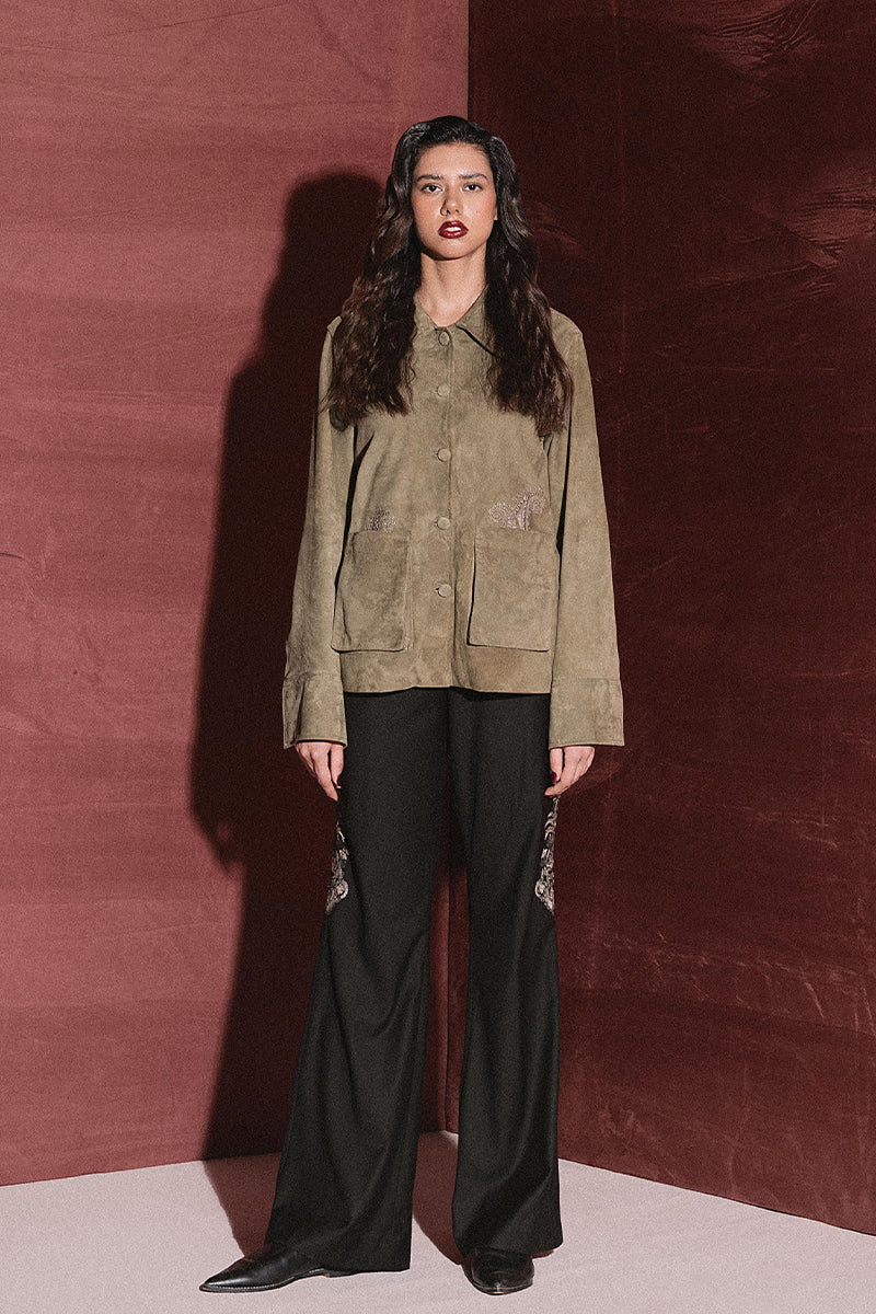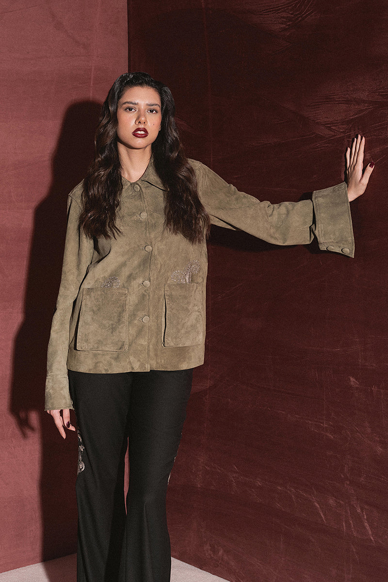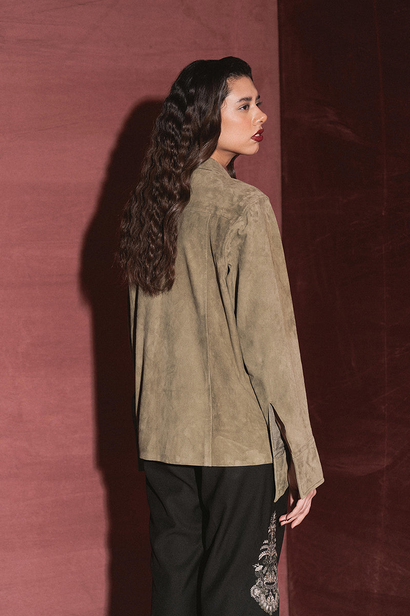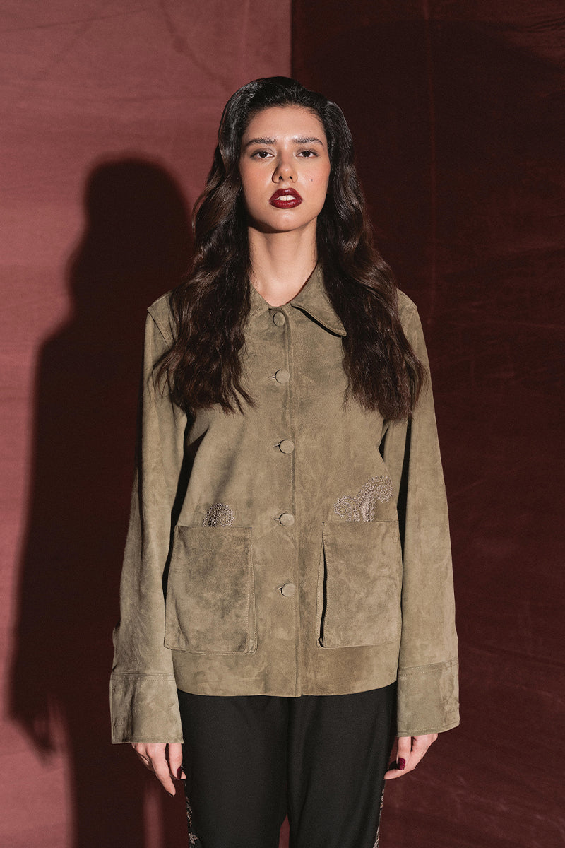 A tailored, moss green toned, pure suede shacket with an effortless fit featuring front pockets and intricate hand-drawn and hand worked embroidery paisley motifs.