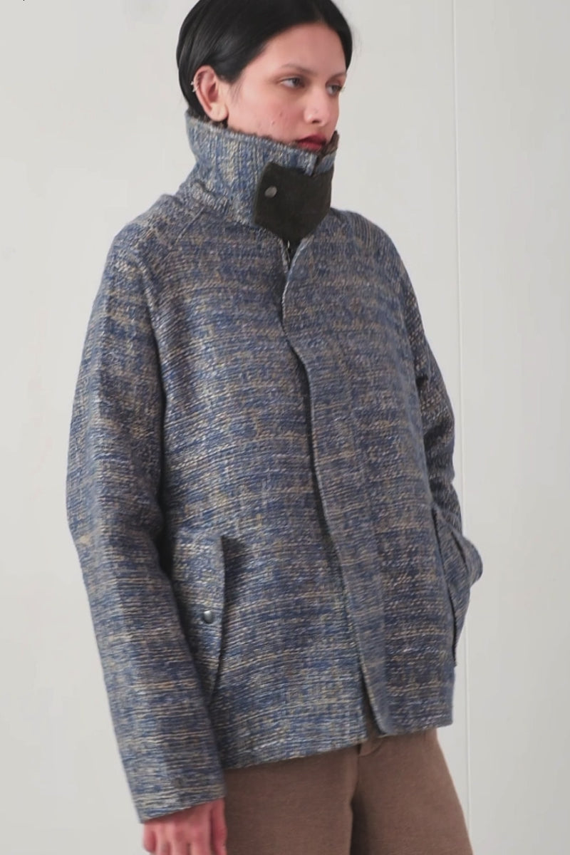 A steel blue tweed jacket inspired by classic utility wear. Featuring a fully handcrafted collar created using a specialised technique for a soft, fur-like texture. Finished with a collar latch, corduroy wales, and snap-button flap pockets.