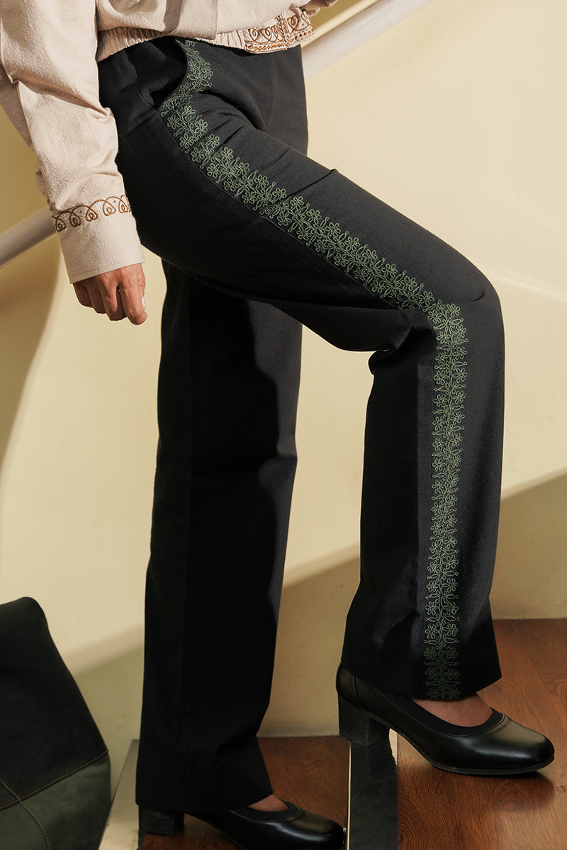 Straight fit, tailored black trousers detailed with intricate green dori work on the side panels.