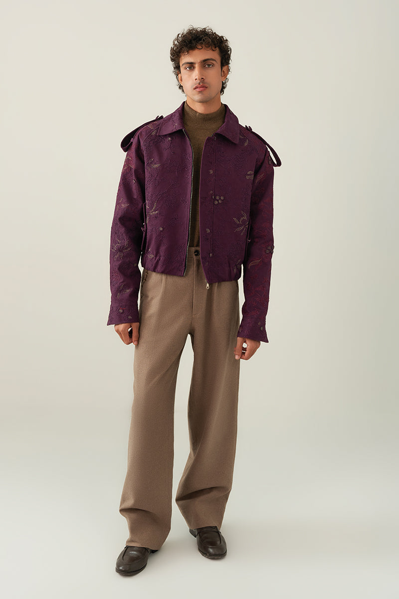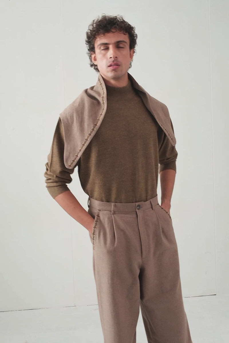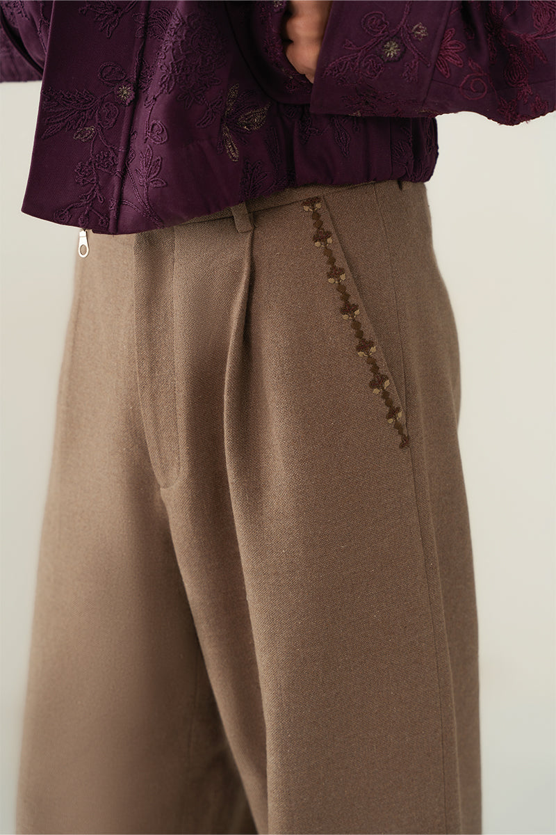 Relaxed-fit trousers crafted from handmade khadi khaddar in a warm tan brown. Finished with embroidered detailing along the side-slit pockets for a minimal yet unique finish