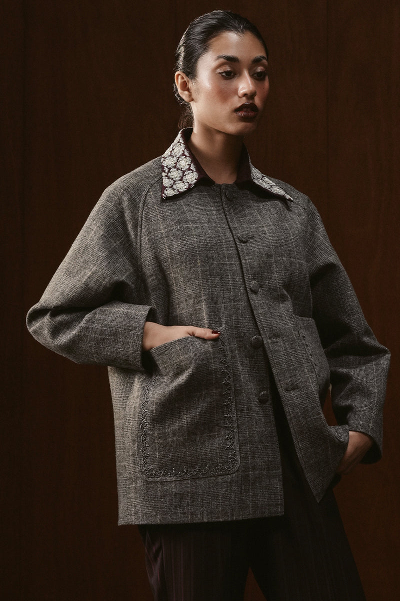 A play on colour, patternwork and texture, the classic, structured woolen check jacket features subtly embroidered front pockets, offset by a contrasting burgundy collar with extensive hand embroidered patternwork.