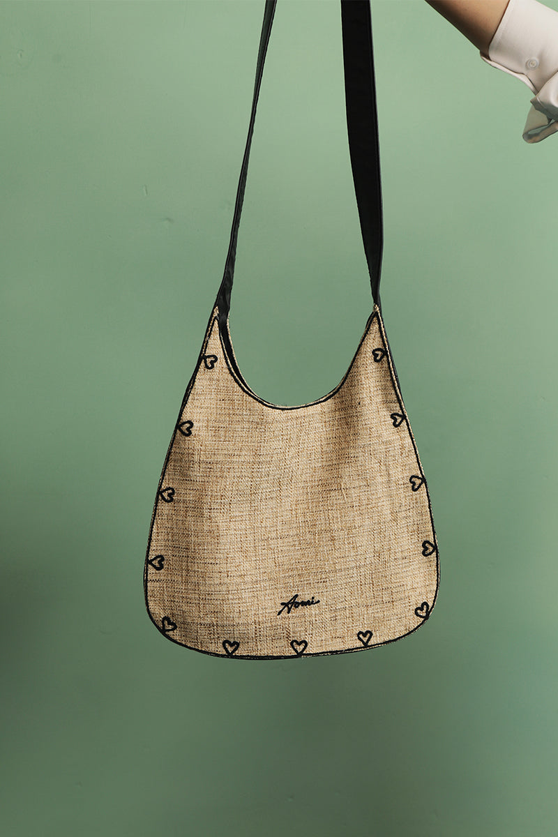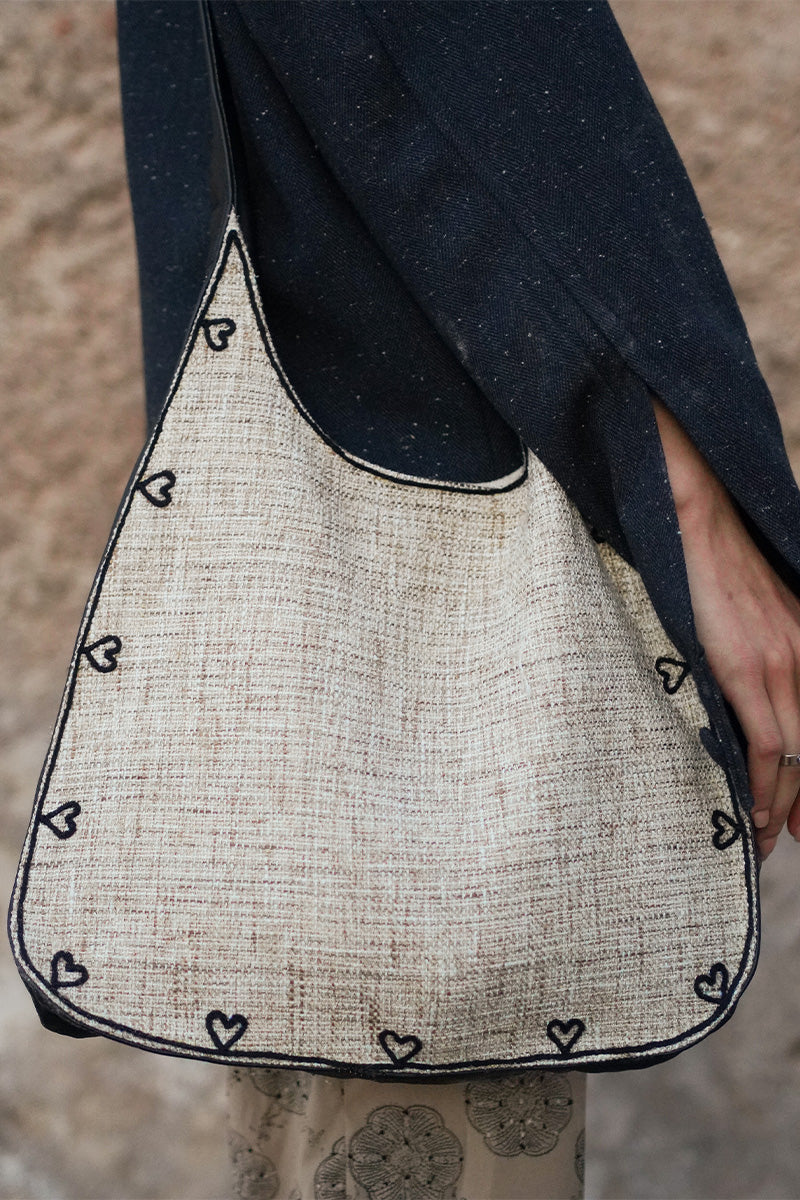 Handmade jute and pure leather bag detailed with Dori-work in Aomi's heart pattern and an easy carry-on leather strap. The Aomi logo appears on the back of the bag.
