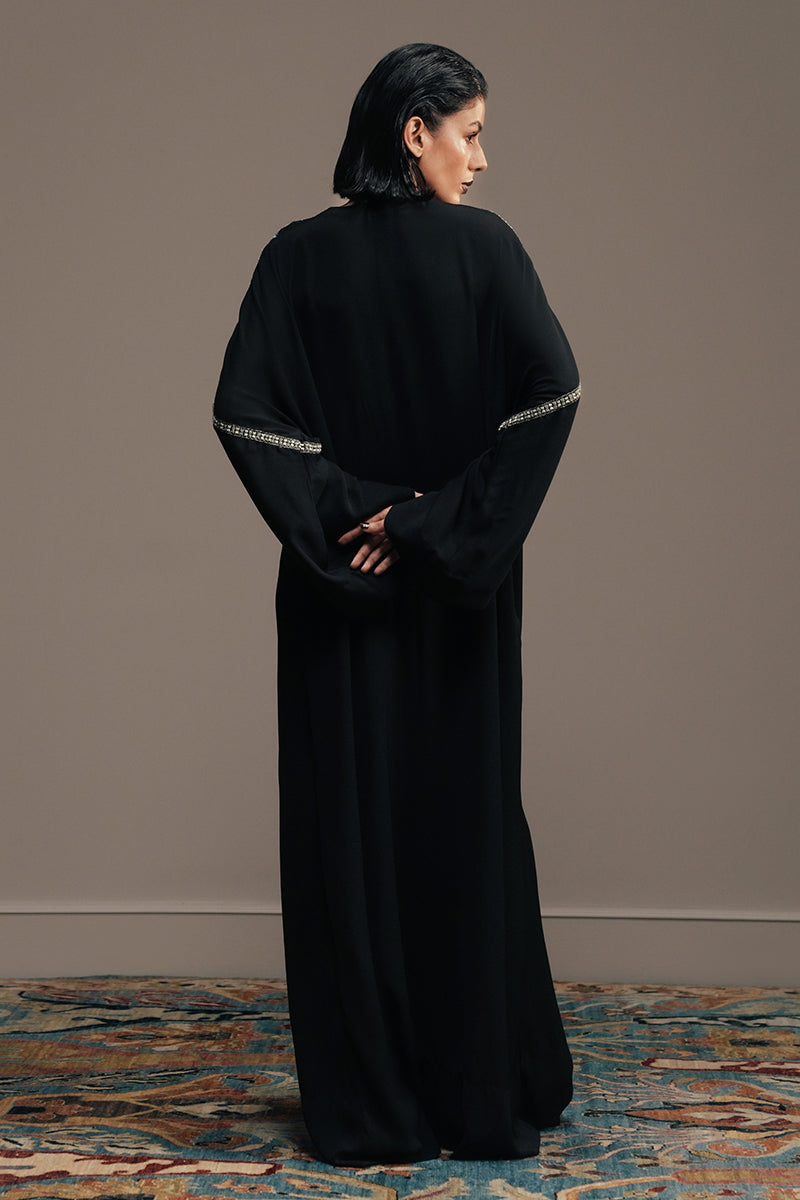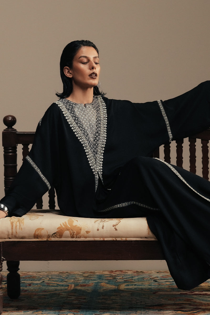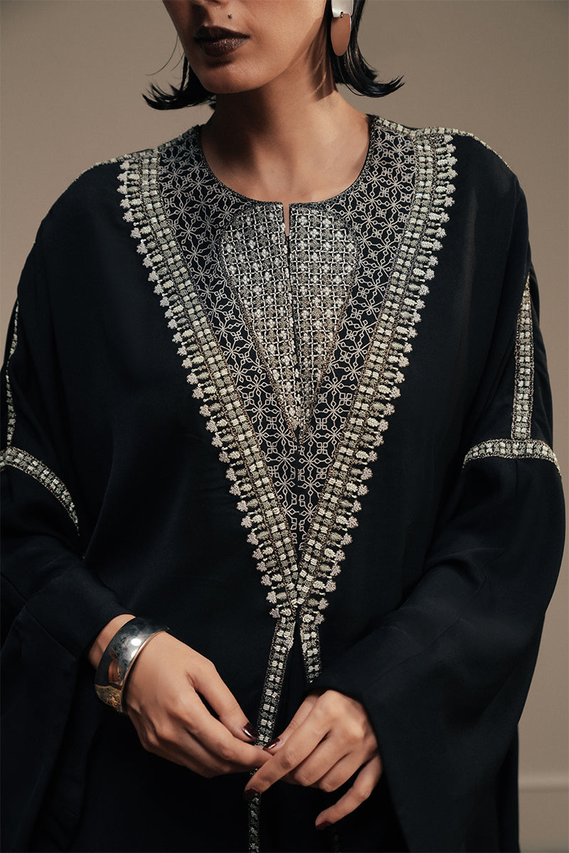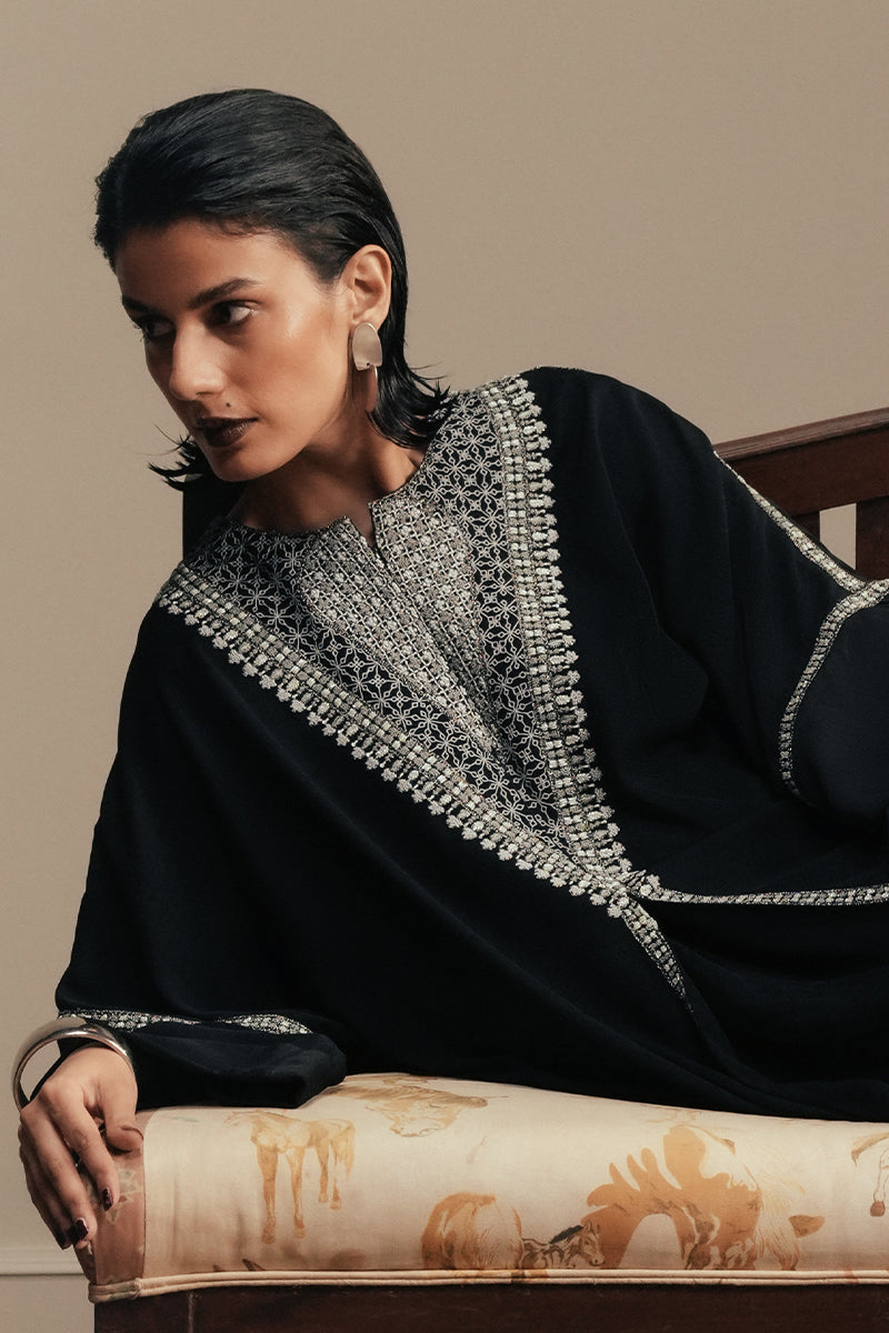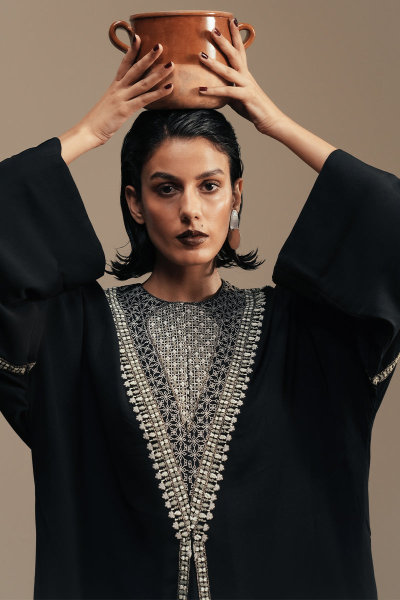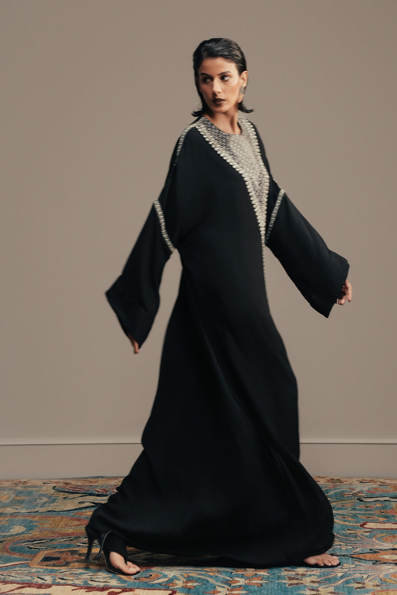 A silk dress intricately hand-embroidered and richly embellished with fine beadwork and thread patterning. Designed with fluid lines that allow movement, it embodies self-assured elegance with artisanal depth.