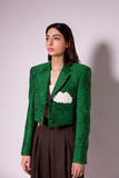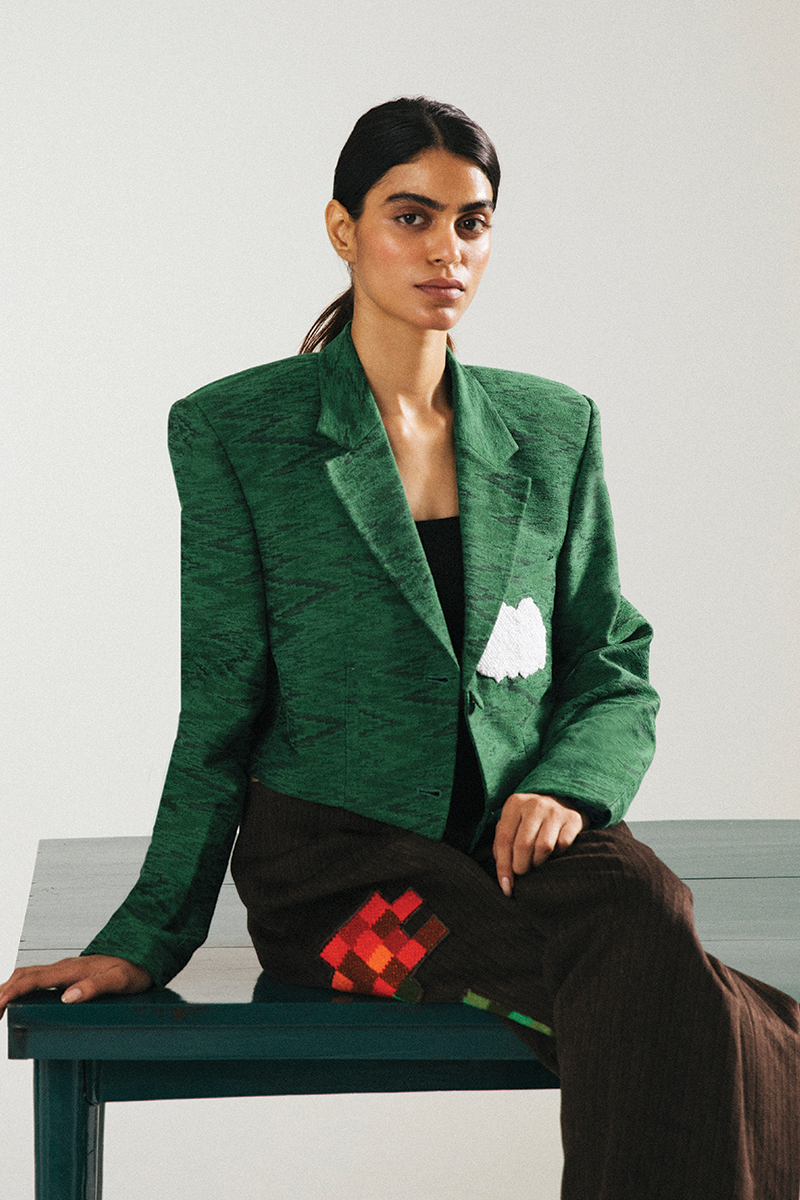 Hand-weaved cotton silk, jacquard cropped blazer with a structured lapel and curved hem. Handcrafted with an iraghi inspired cloud detailing with reference to symbolism from the artist Jahanzaibay's works.