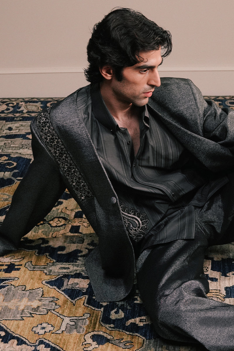 Tailored with an artisanal edge, the silk-karandi lapelless blazer with a single-button closure features hand-embroidered asymmetrical embroidery in tonal black, grey, and silver across the shoulder, sleeve, and waist—showcasing craft in modern form. Pair it with the Shashi Tailored Trousers