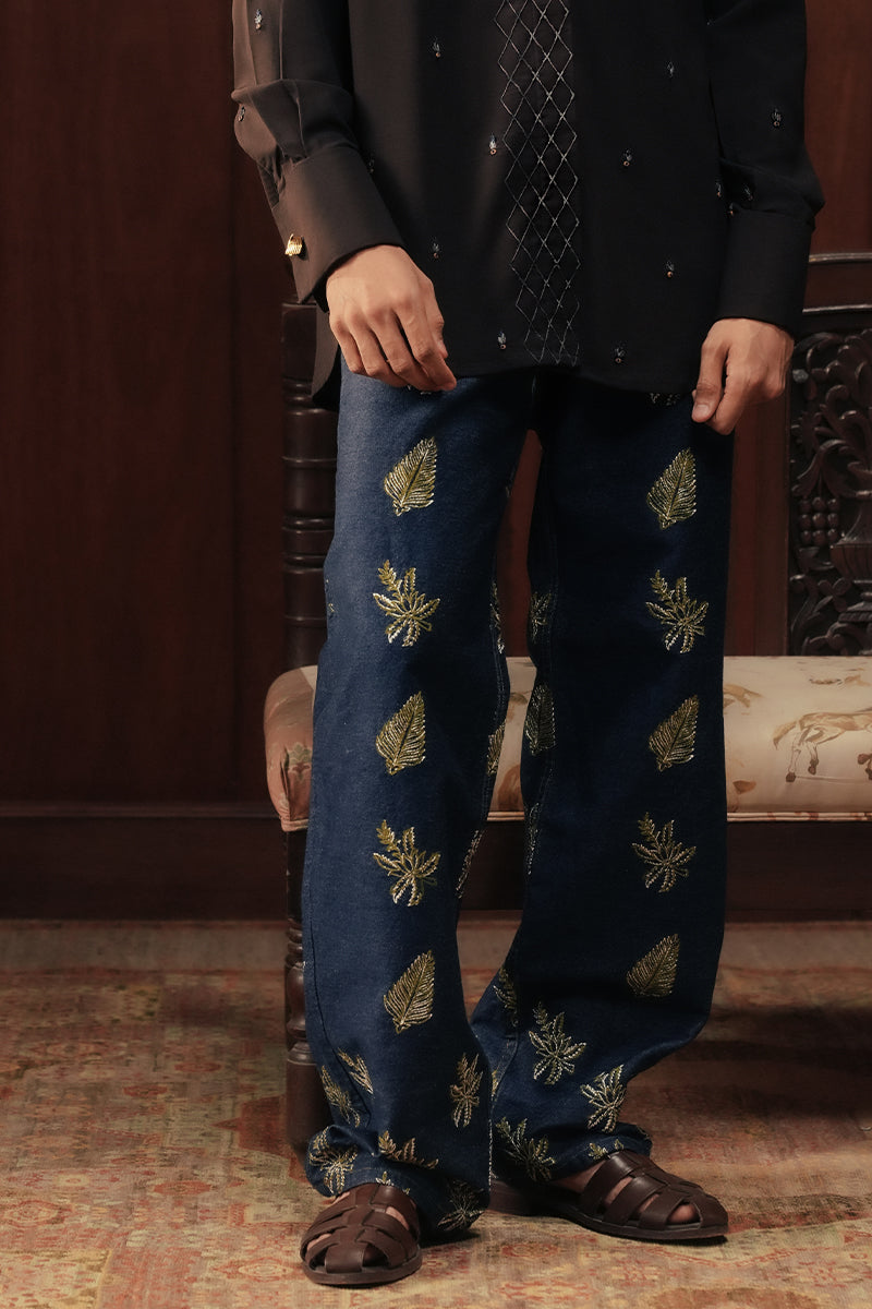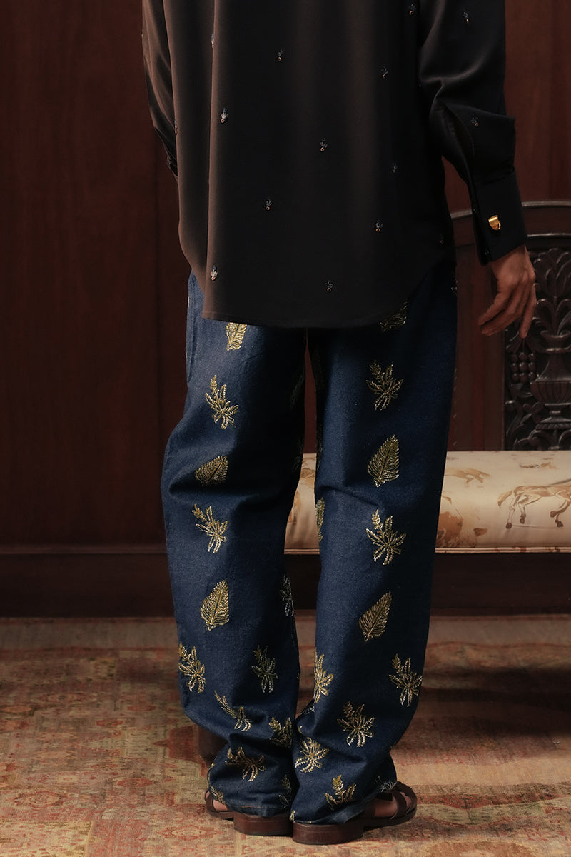 Straight-cut washed denim, elevated with hand-embroidered and block-printed motifs. Intricate beadwork traces the pocket edges, bringing artisanal beauty to a timeless silhouette.