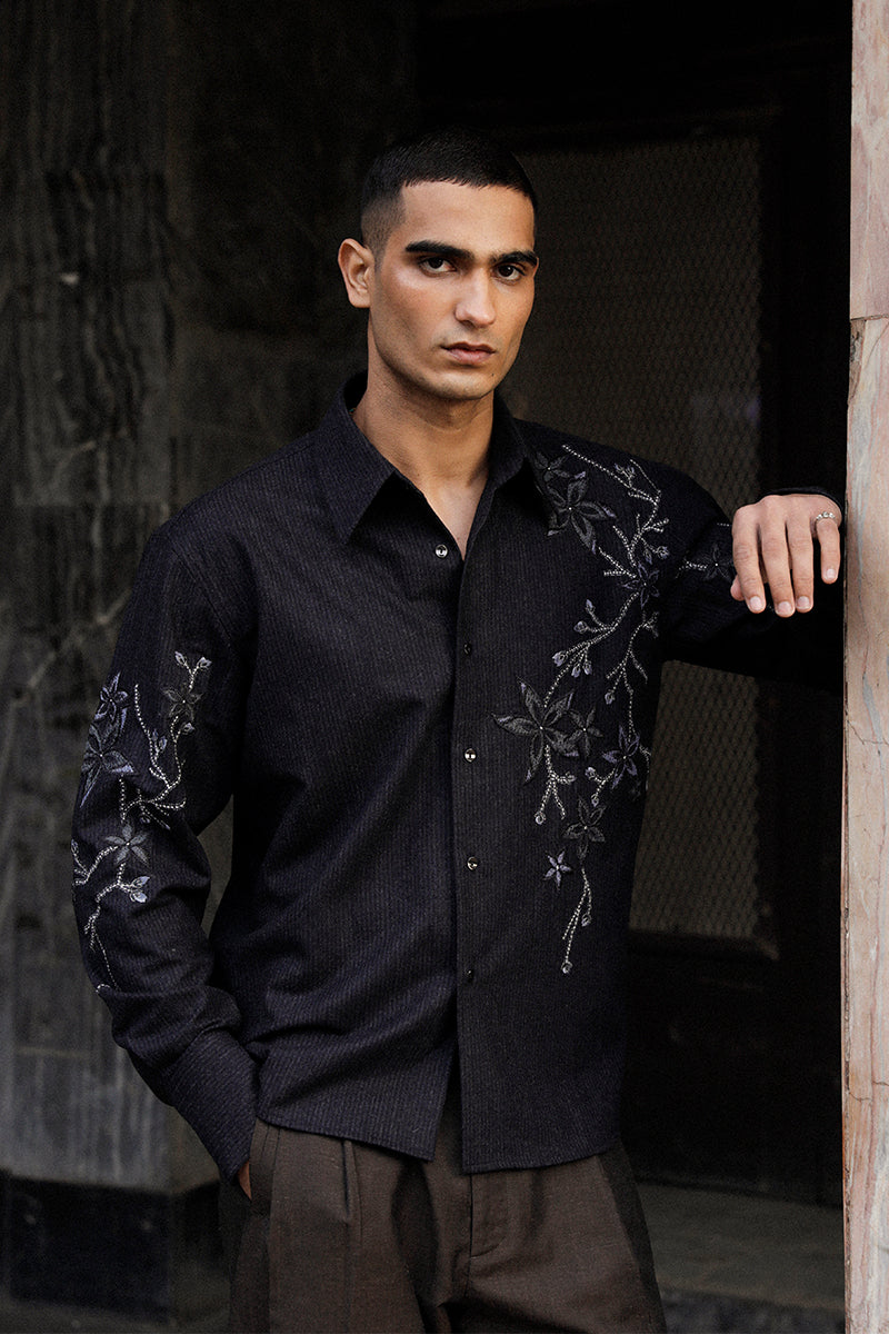 Hand-drawn wool button-up tailored shirt with floral embroidery and net patchwork. The shirt features tilla a d resham handiwork.