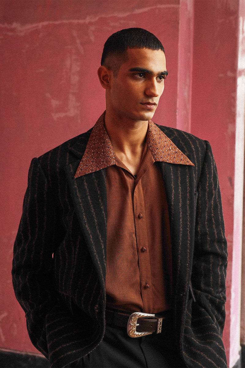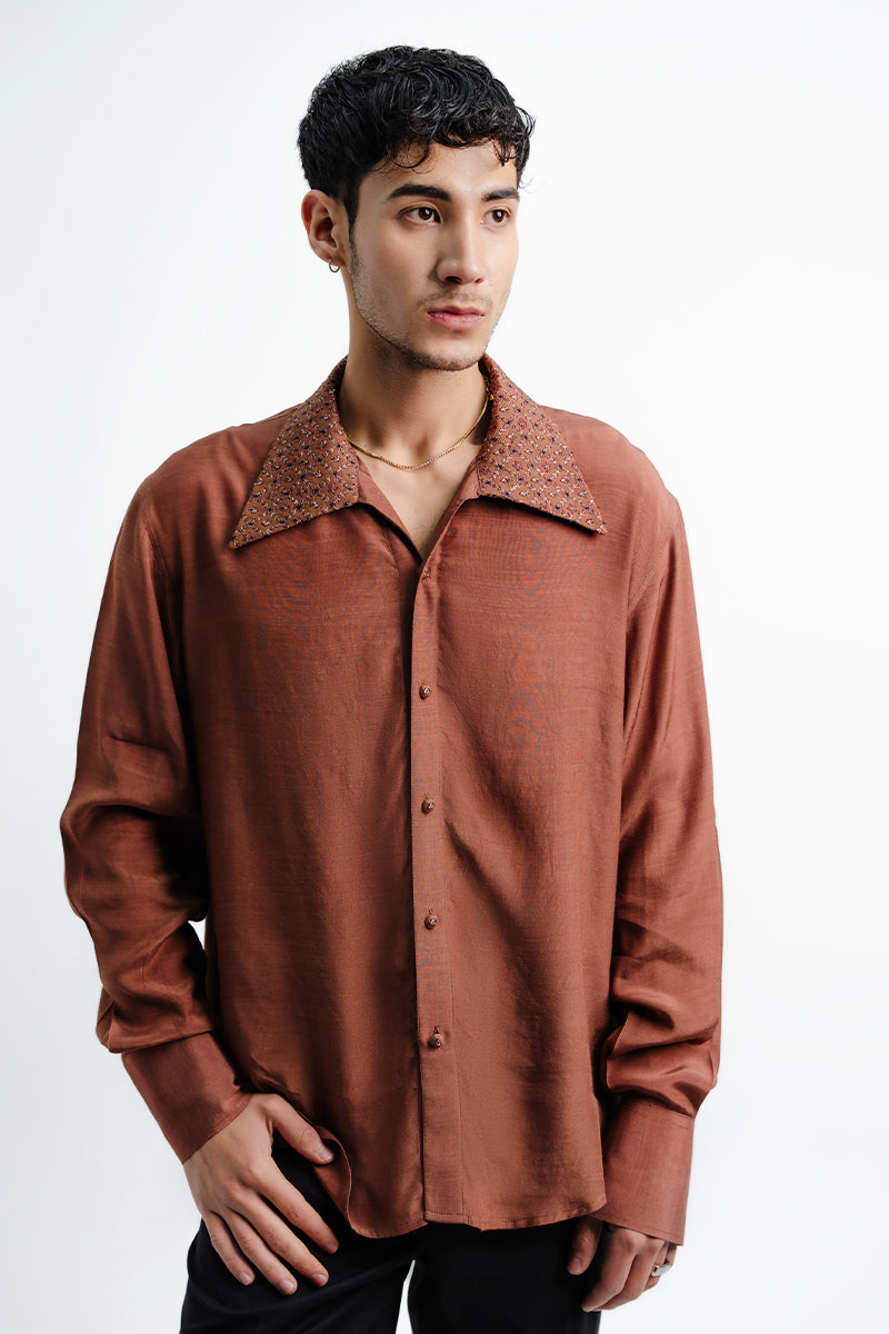 Bronze raw silk button-up shirt with an intricately embroidered exaggerated collar.