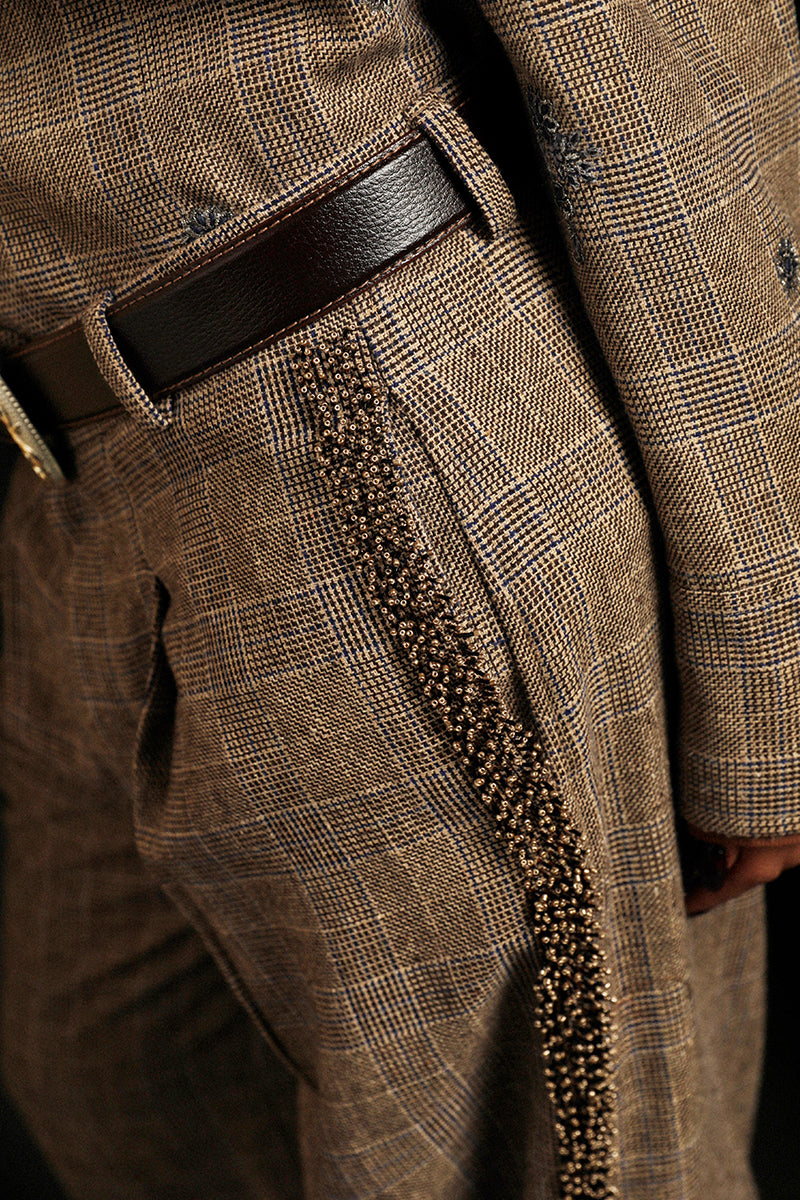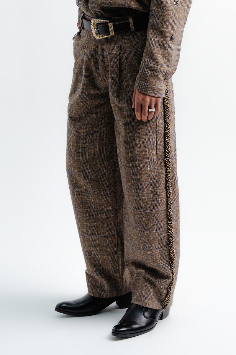 Tweed straight cut tailored trousers with hand embellished bead side strip.