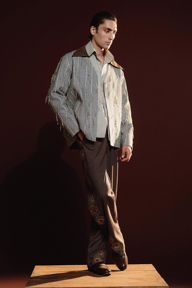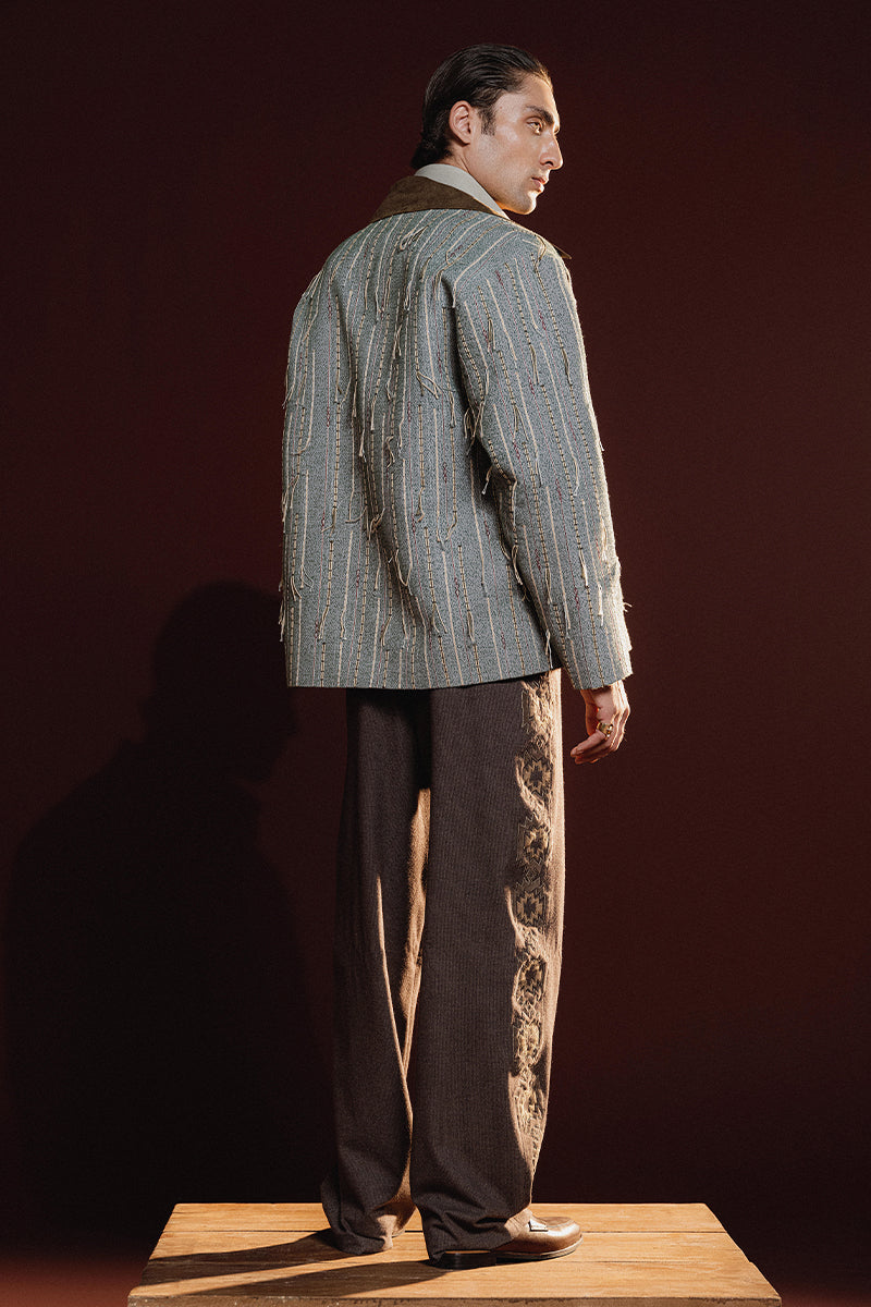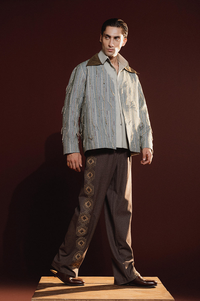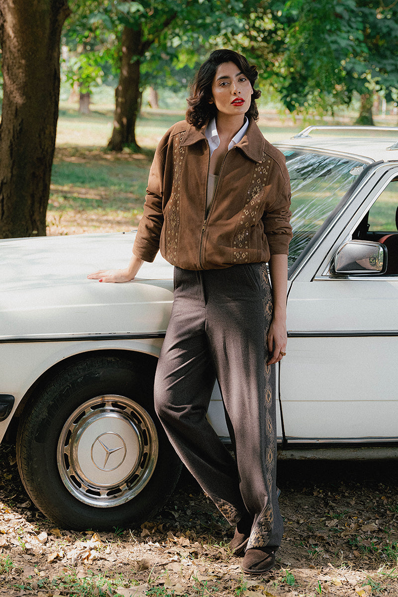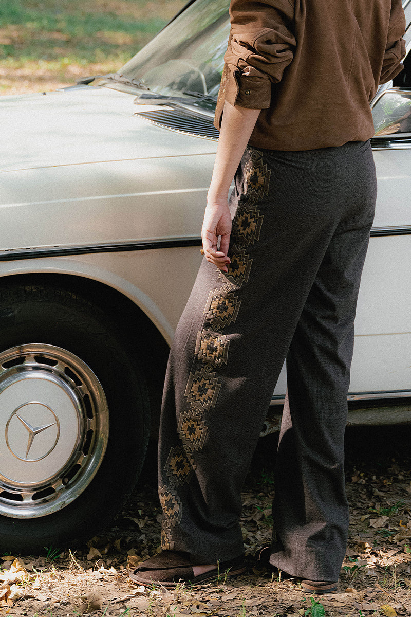The Ayra Trousers in a textured wool fabric tailored for a straight cut detailed with laser cut motifs crafted from beige and cream imitation suede patchwork.